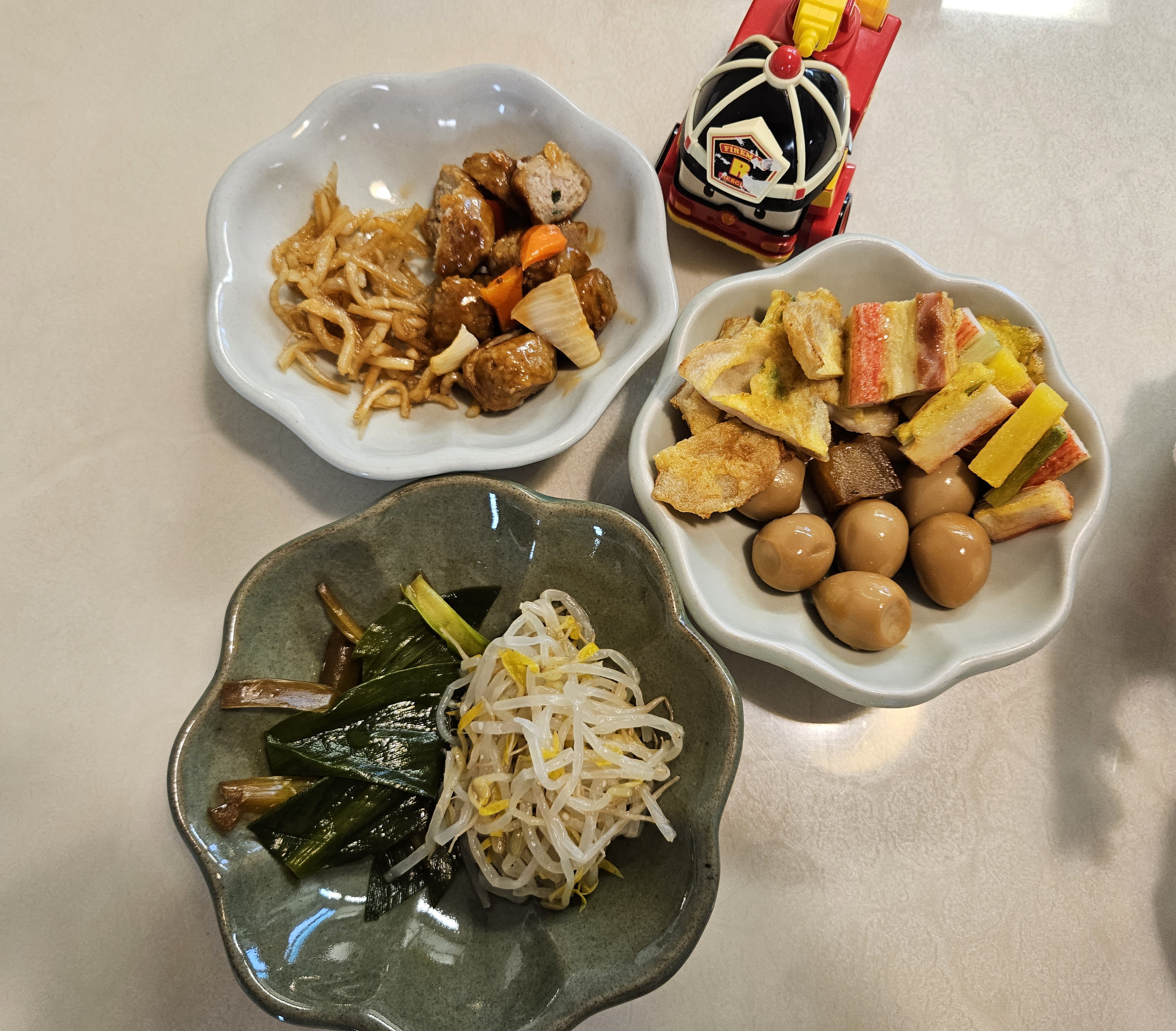 35개월 아들 먹기 편하게 반찬을 가위로 잘랐는데요. 얼마나 맛있길래 와이프가 절 끌고 갔는지 맛을 한번 봤습니다. 그런데 반찬들이 다 짜지 않고 삼삼하니 맛있더라고요. 그리고 아들도 간장진미채 맛보더니 젤리 갔다면서 밥이랑 맛있게 먹었고 거기에 고기전, 꼬치전, 미트볼, 명이나물도 잘 먹었답니다.