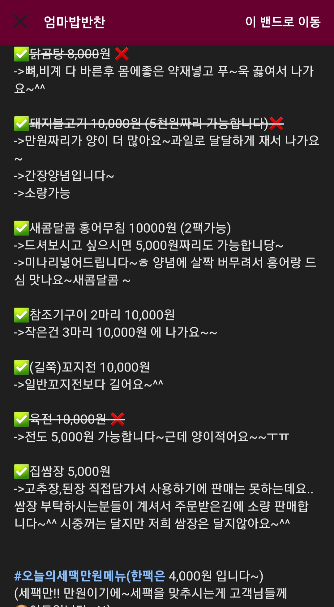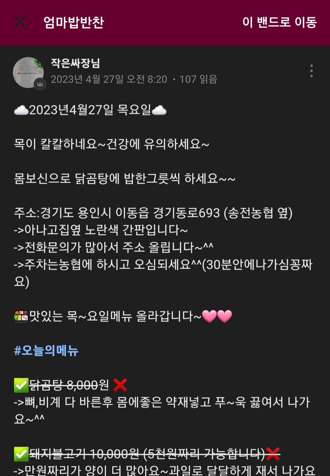 반찬 메뉴는 가게 문 앞에 주단위로 A4 용지를 붙여놓으시거나 네이버 밴드를 통해 매일 공지가 올라오는데요.