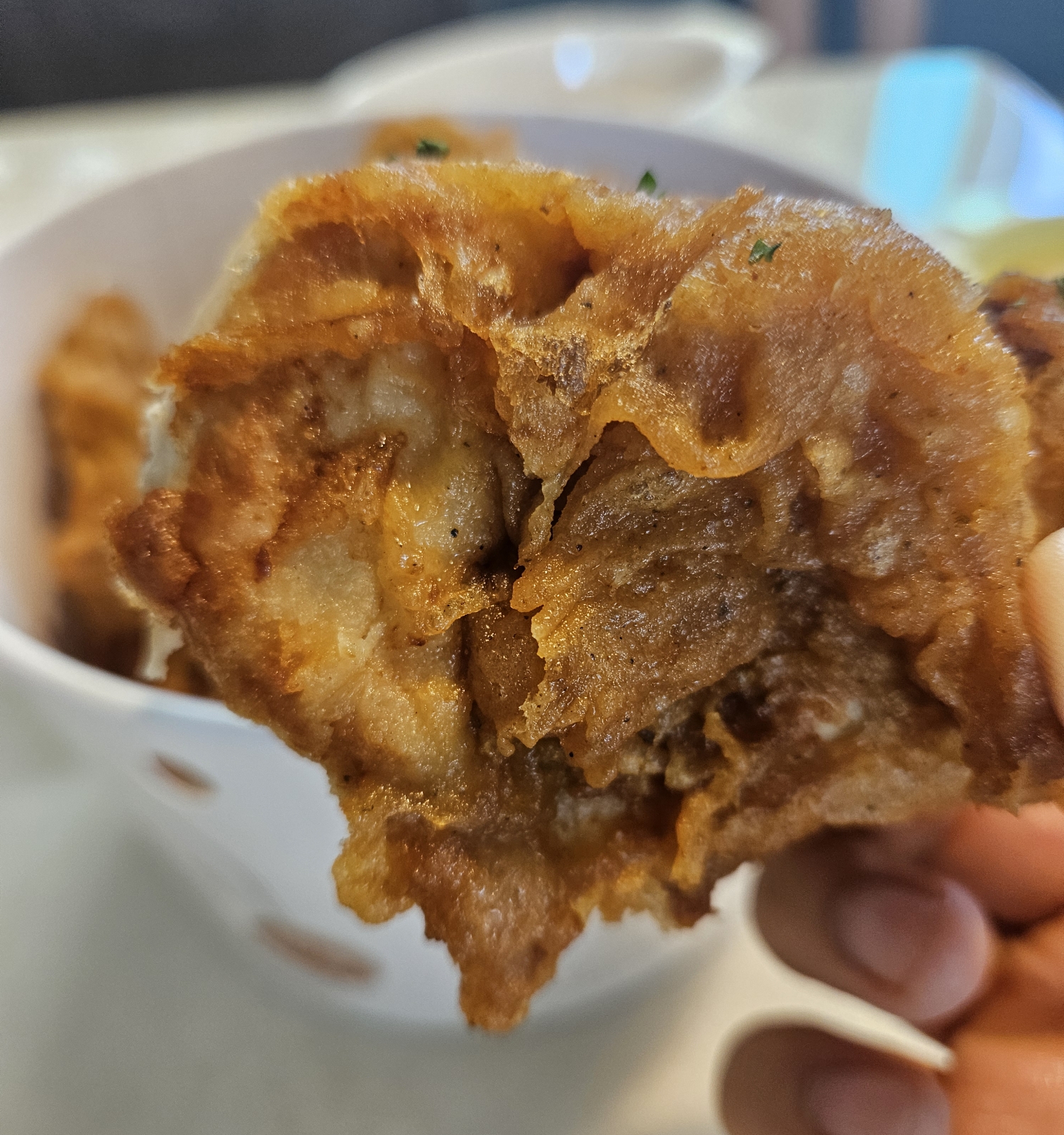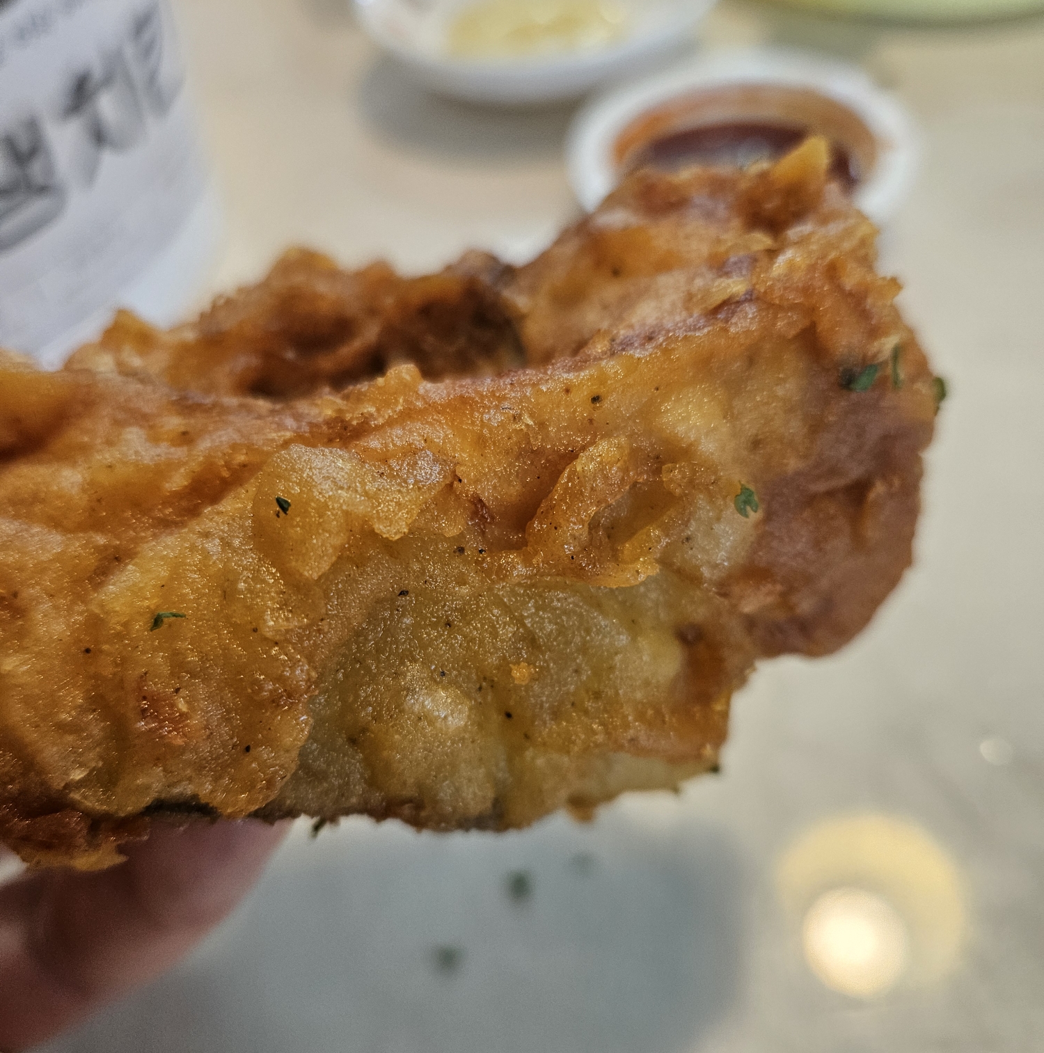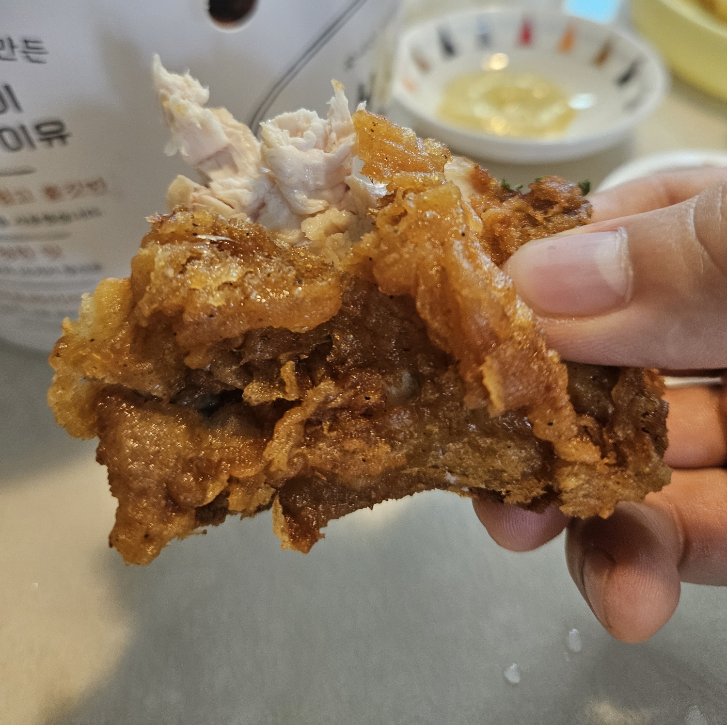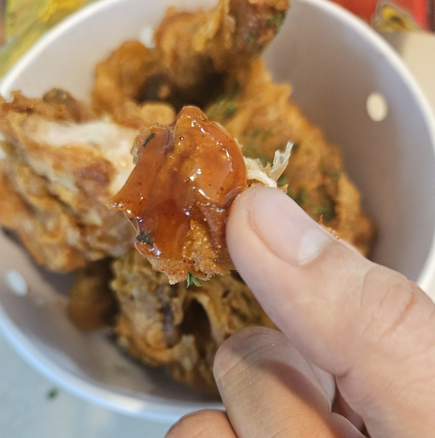 우선 퍽퍽 살 부분을 양념소스에 찍어먹어 보았는데요. 치킨이 식었는데도 튀김옷이 어찌나 바삭거리던지. 앞서 말씀드린 것처럼 조각 하나하나가 큰 편이라 살도 은근히 많더라고요.
