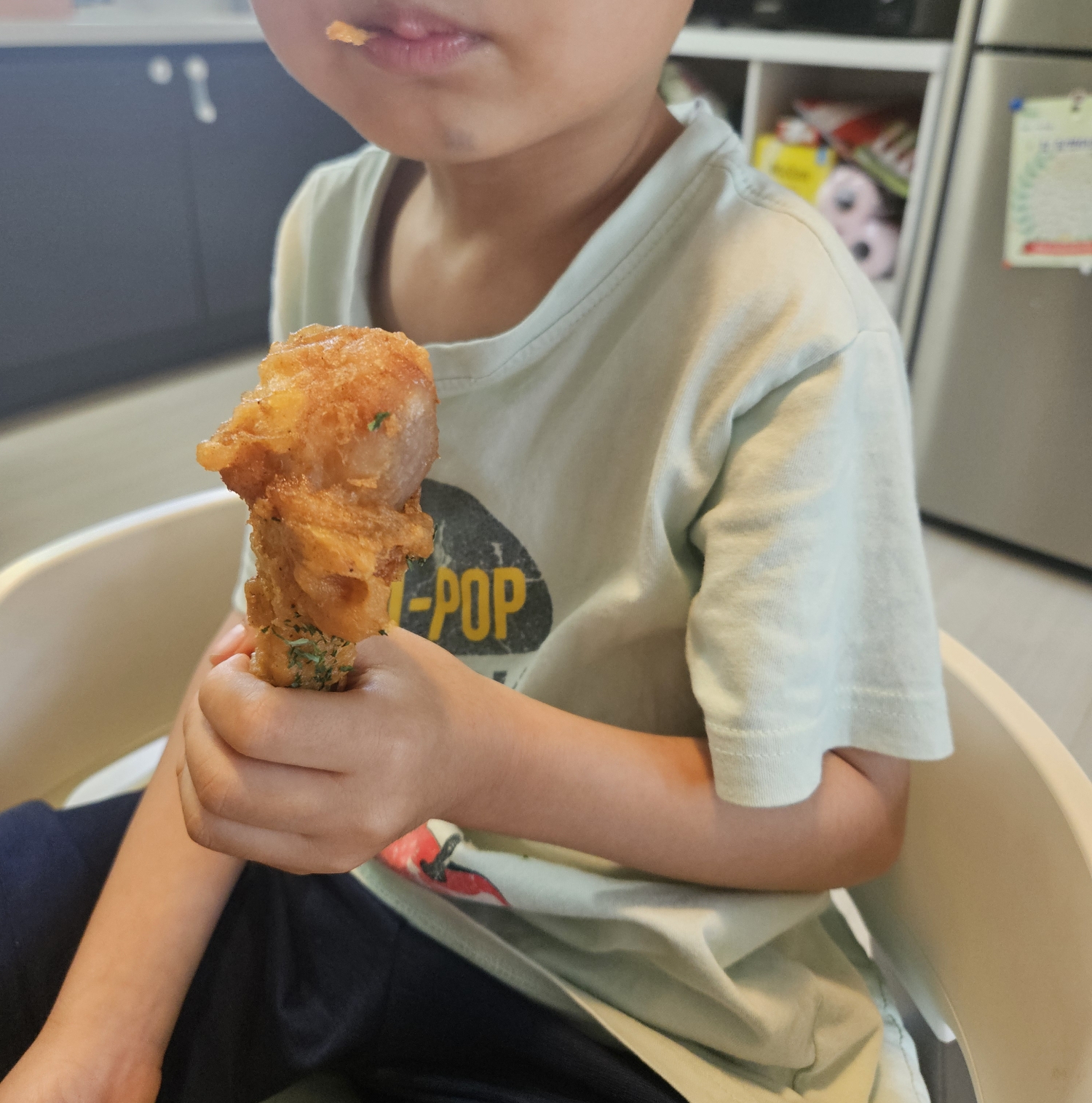 아들도 닭다리 하나 들고 맛있게 냠냠. 치킨옷이 바삭거린다면서 맛있다고 좋아하는 모습이 어찌나 귀엽던지 먹기 편한 닭다리 부분은 아들이 먹었답니다.
