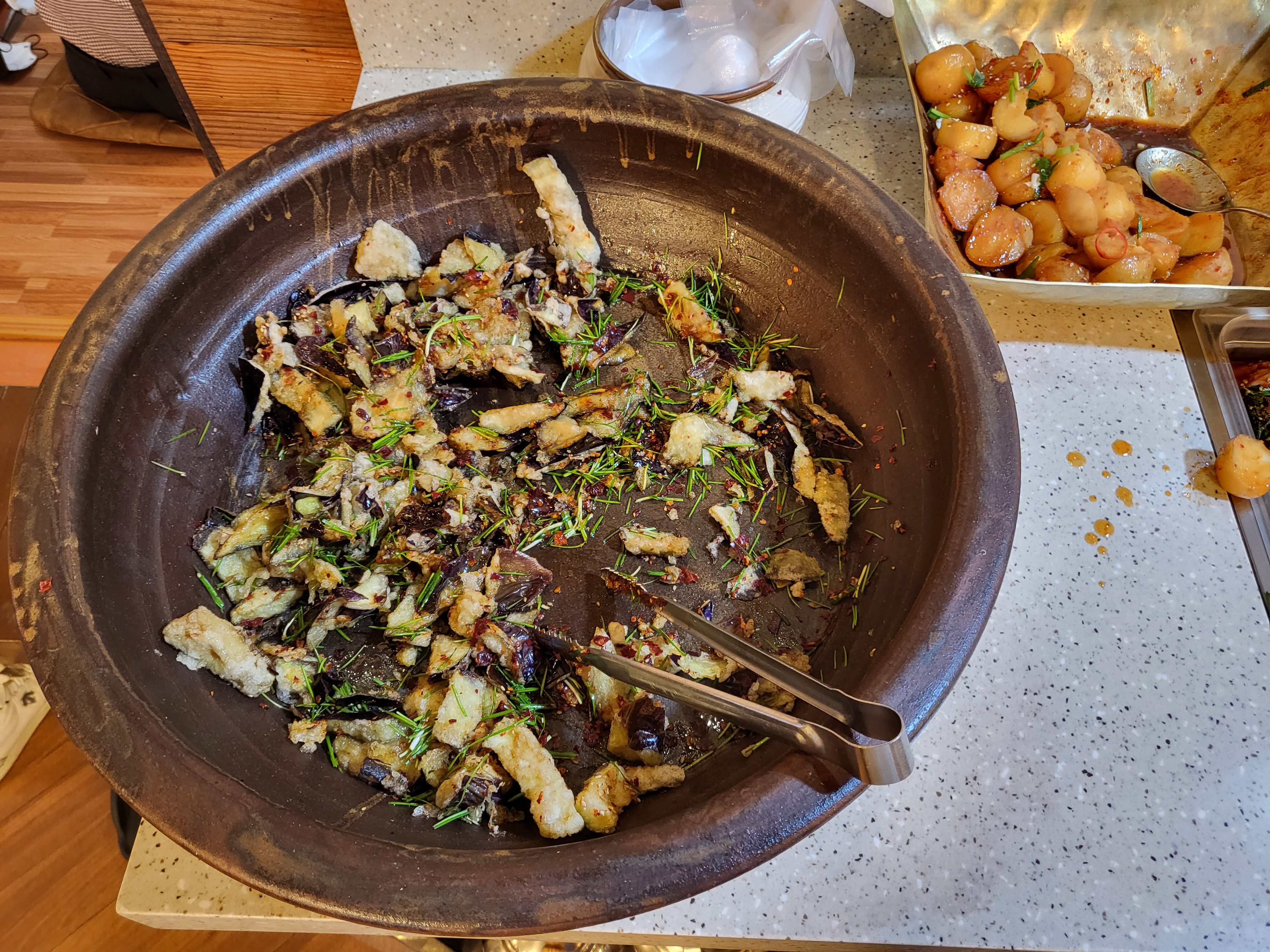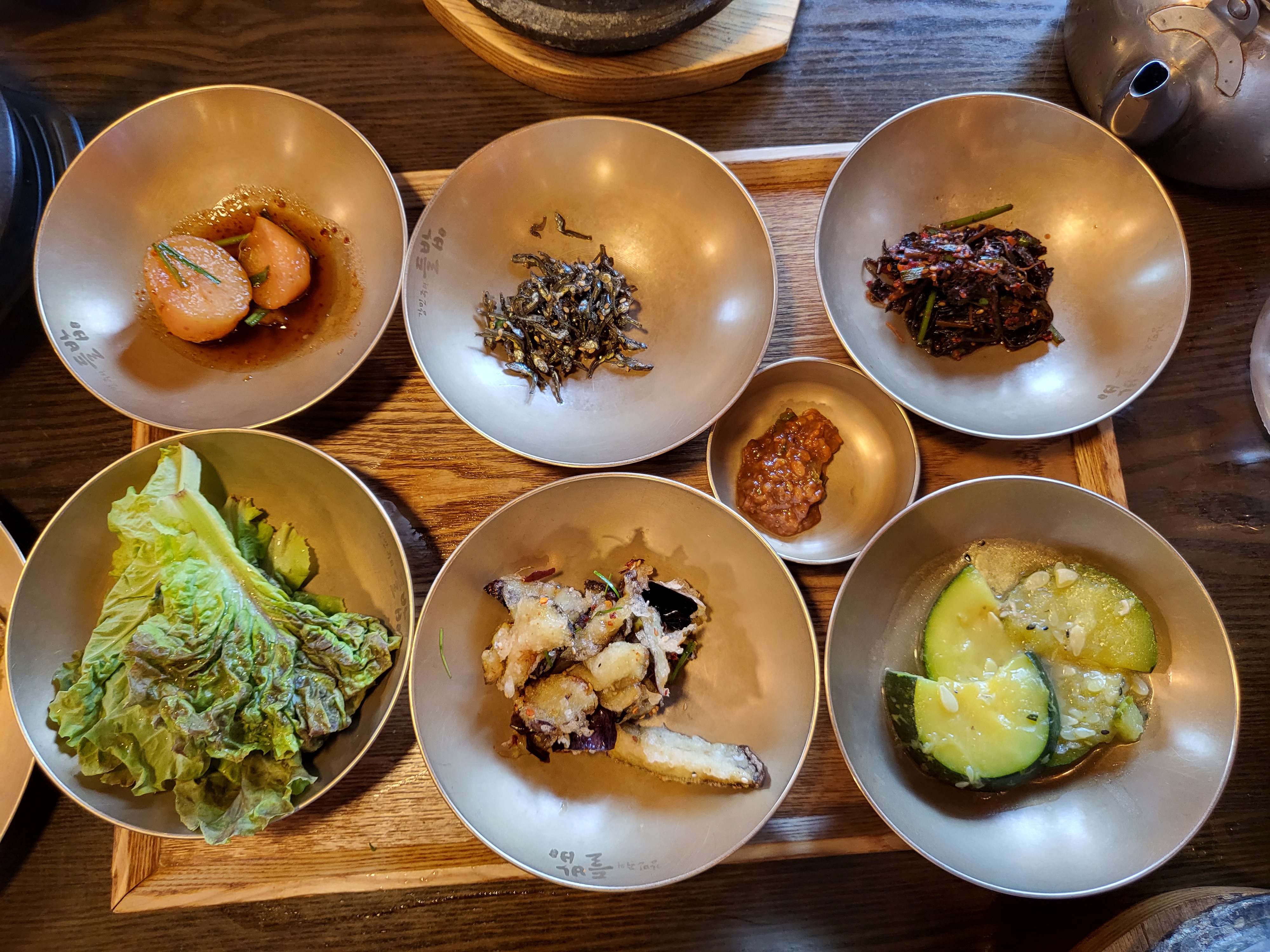 그리고 음식을 시키지 마자 약 5분 뒤에 바로 제철 반찬들을 세팅해 주셨습니다. 제철 반찬들이 대체적으로 짜지 않고 정말 맛있습니다. 그중 가지 튀김이랑 감자조림, 깻잎, 마늘종, 김치, 나물을 제일 맛있게 먹었습니다.