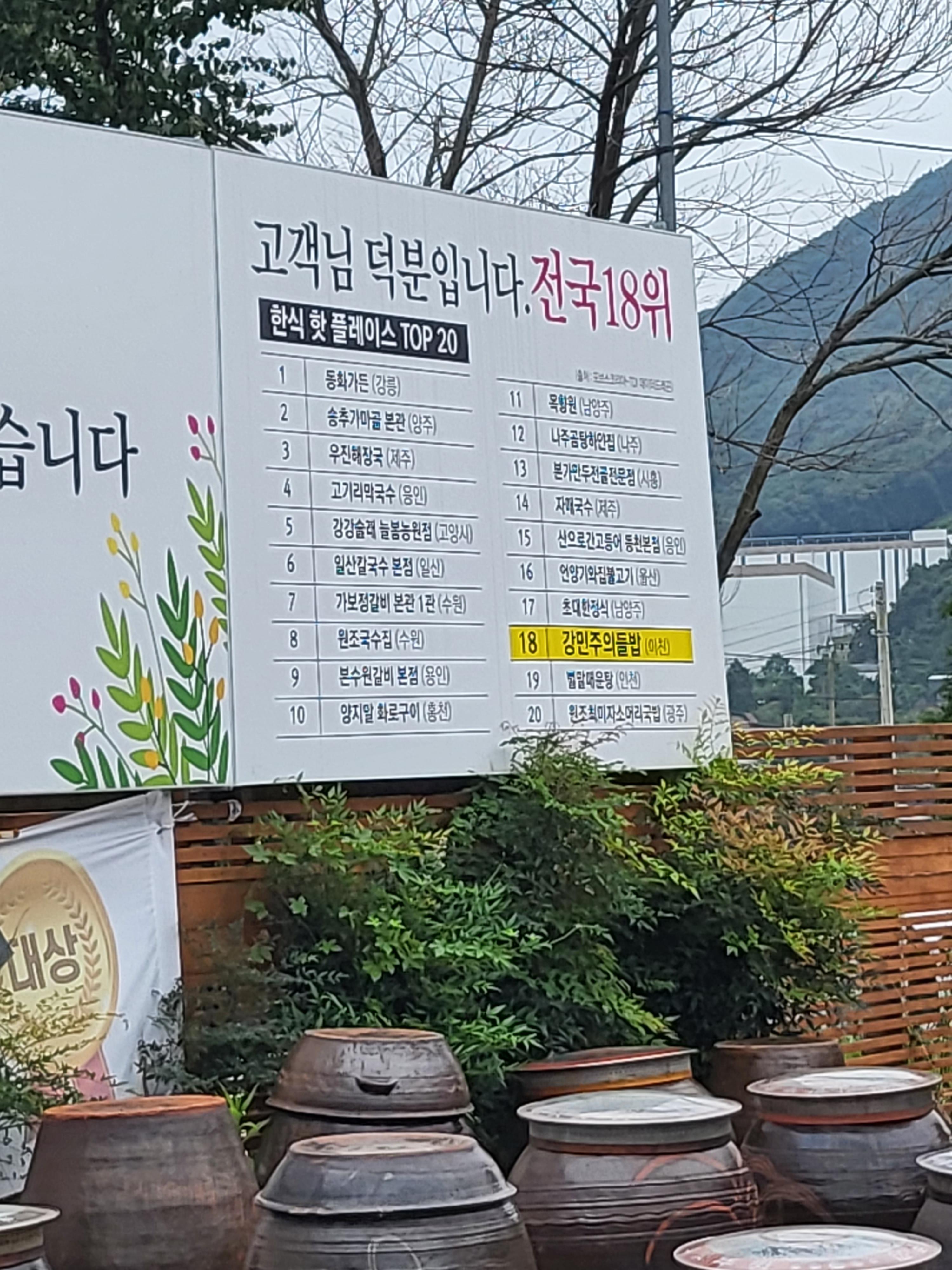 가게 바로 맞은편에는 장독대가 있고 바로 위 현수막에 쓰여있는 글씨를 보니 1999년부터 시작했다고 하는데 그럼 벌써 23년이나 된 유명한 한식당이더라고요. 그리고 한식 핫 플레이스 탑 20위 안에 들었던 적도 있었다고 합니다. 그것도 전국 18위!!