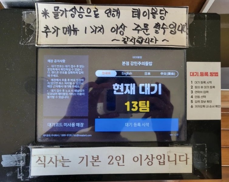 워낙 유명한 한식집이어서 그런지 들어가서 테이 블링 대기 등록을 해줘야 하더라고요. 저는 오전 11시 55분쯤 도착해서 대기 등록을 했는데도 대기번호 47번에 8번째까지 기다려줘야 했습니다.