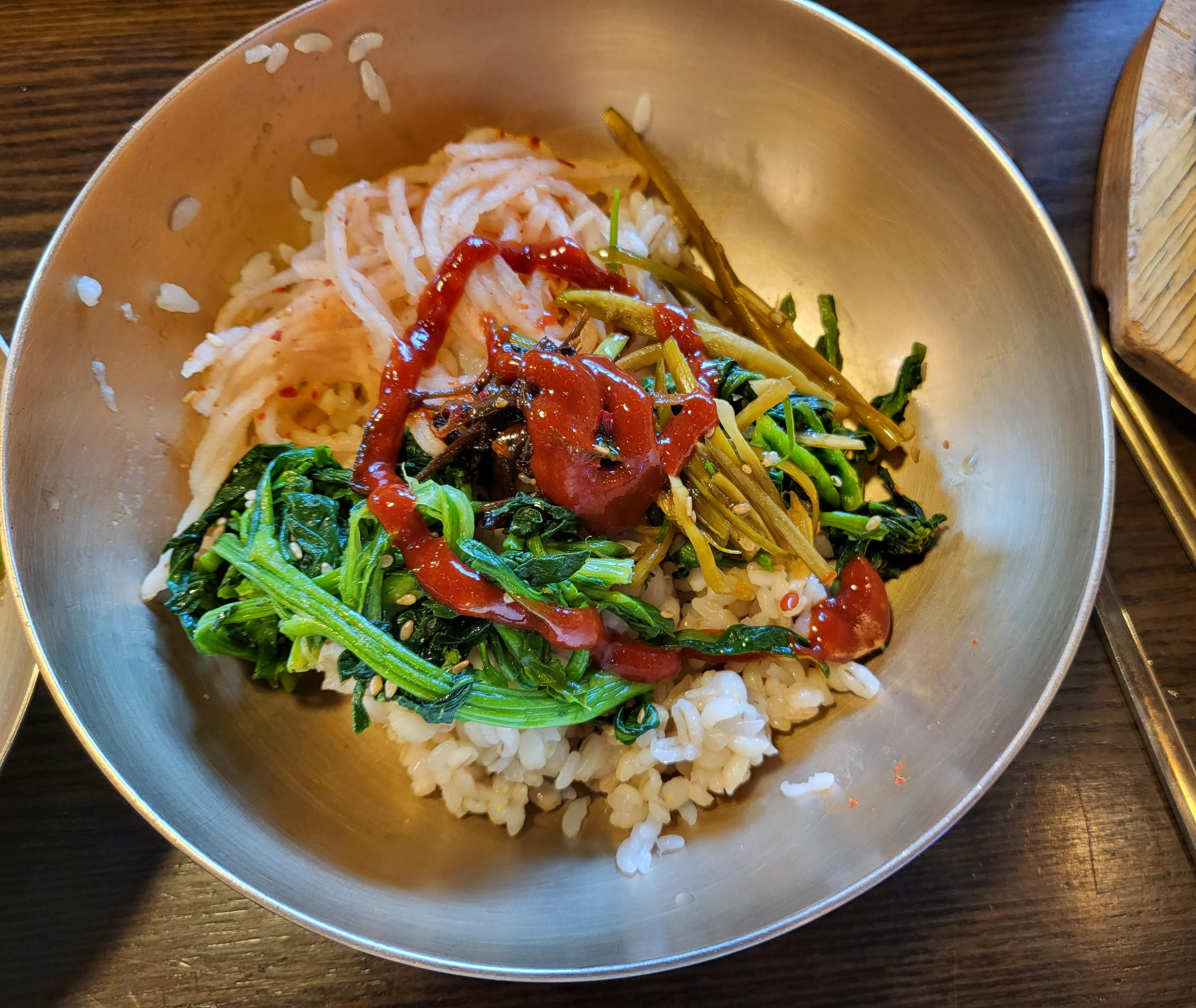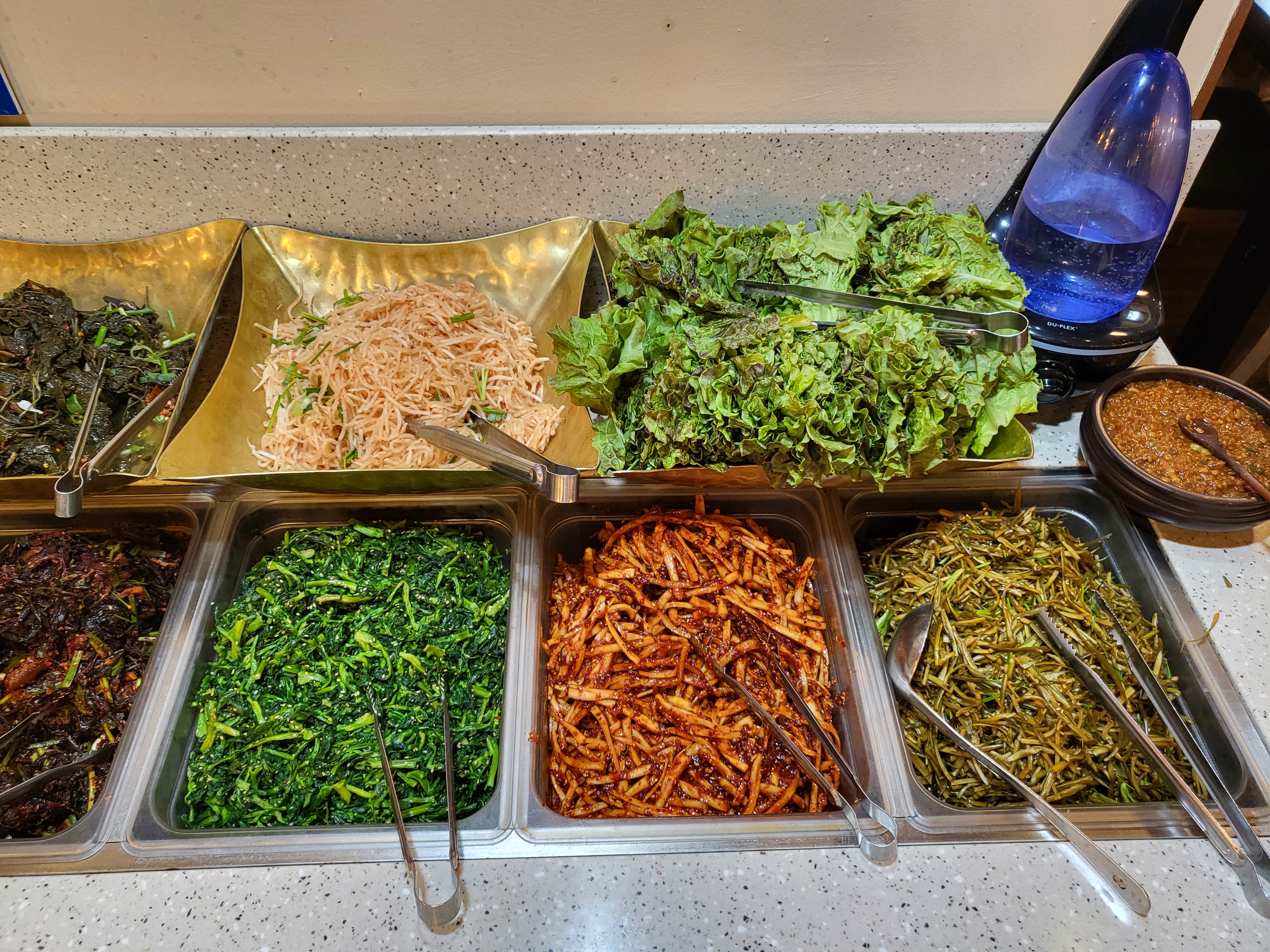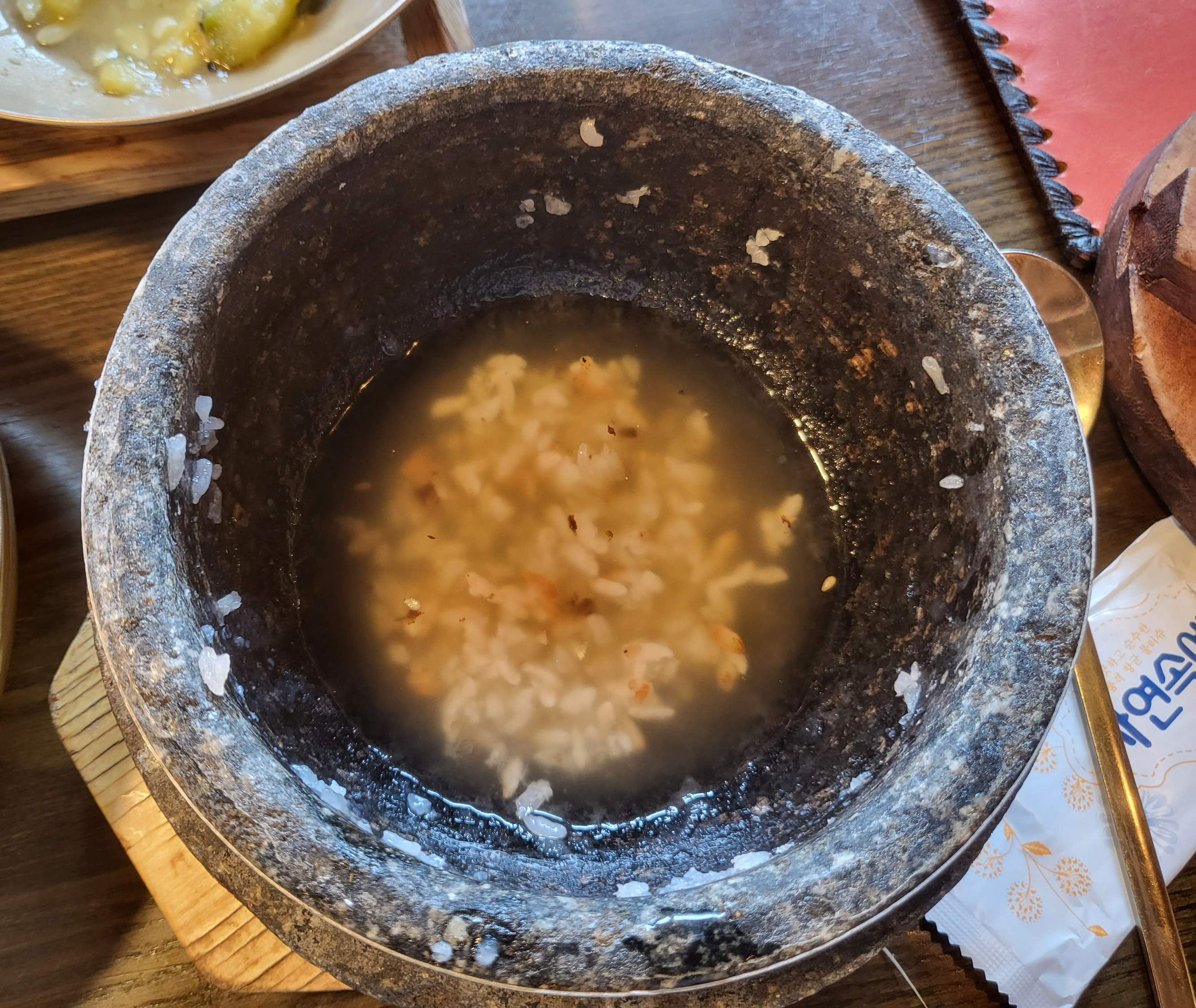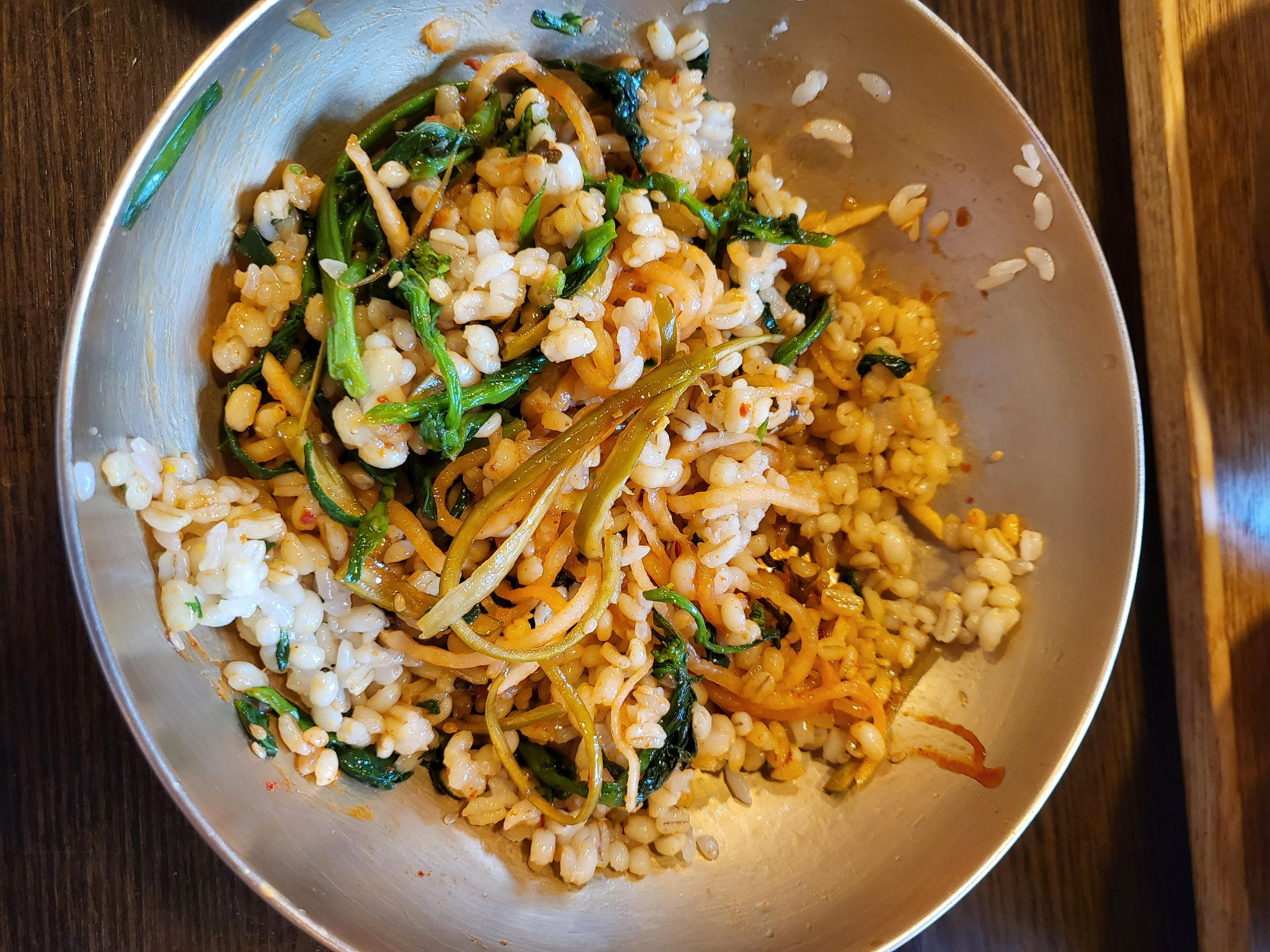 그래서 저는 돌솥밥을 다 먹은 뒤 추가로 보리밥을 퍼와서 각종 나물들을 넣어 보리 비빔밥을 만들어 한 그릇 더 뚝딱 먹고 거기에 숭늉까지 먹었습니다. 건강식을 아주 배 터지게 먹고 온 셈이죠.
