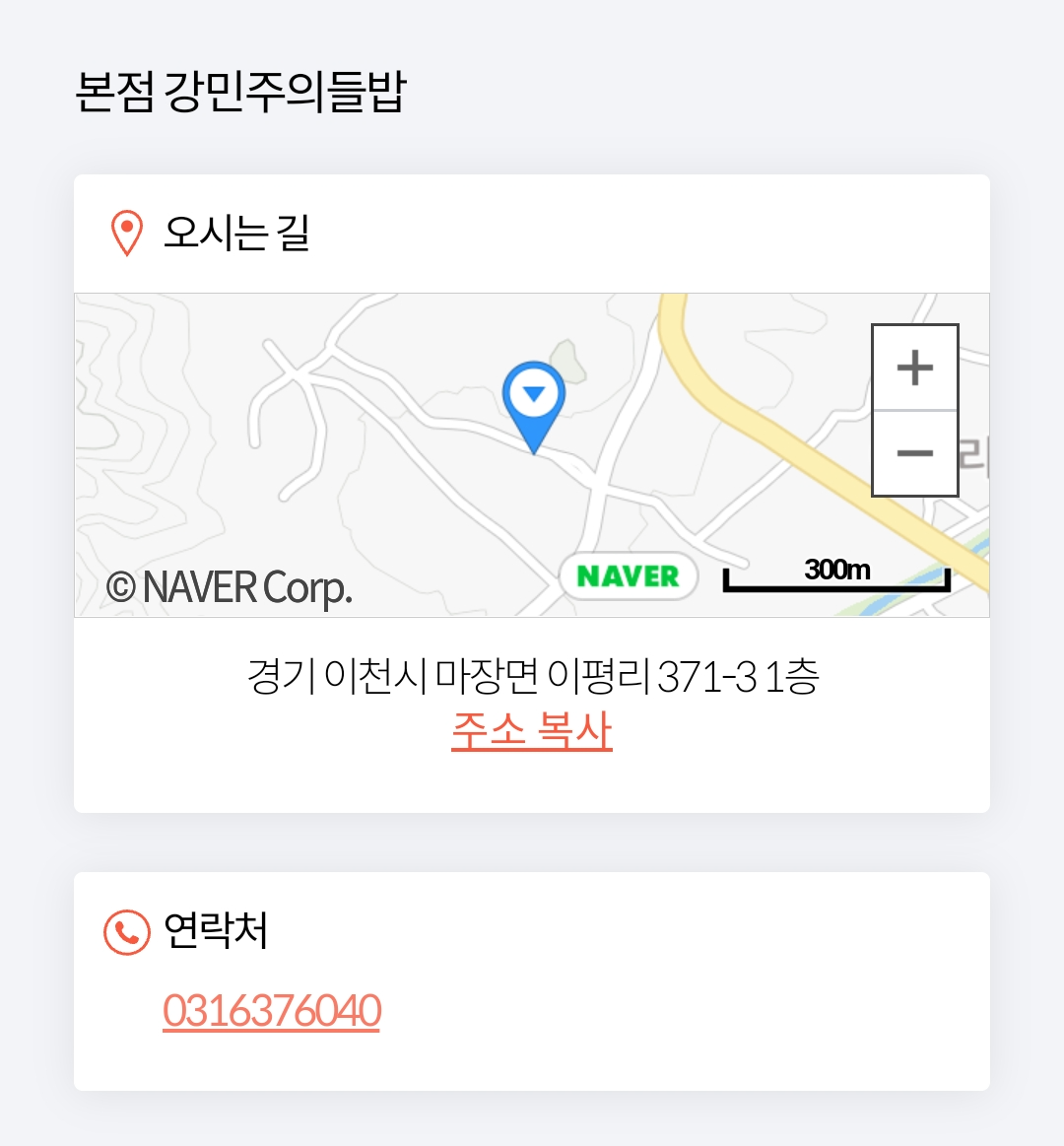 위치는 경기 이천시 마장면 이평리 371-3 1층 기본 30분 이상은 기다리셔야 하니 여유를 가지고 방문하시는 걸 추천드리며, 짜고 간 쌘 음식을 좋아하시는 분들한테는 건강식이다 보니 간이 조금 심심하게 느껴지실 수도 있습니다. 그래도 한식을 좋아하신다면 꼭 한 번쯤 방문해보는 걸 추천드립니다.