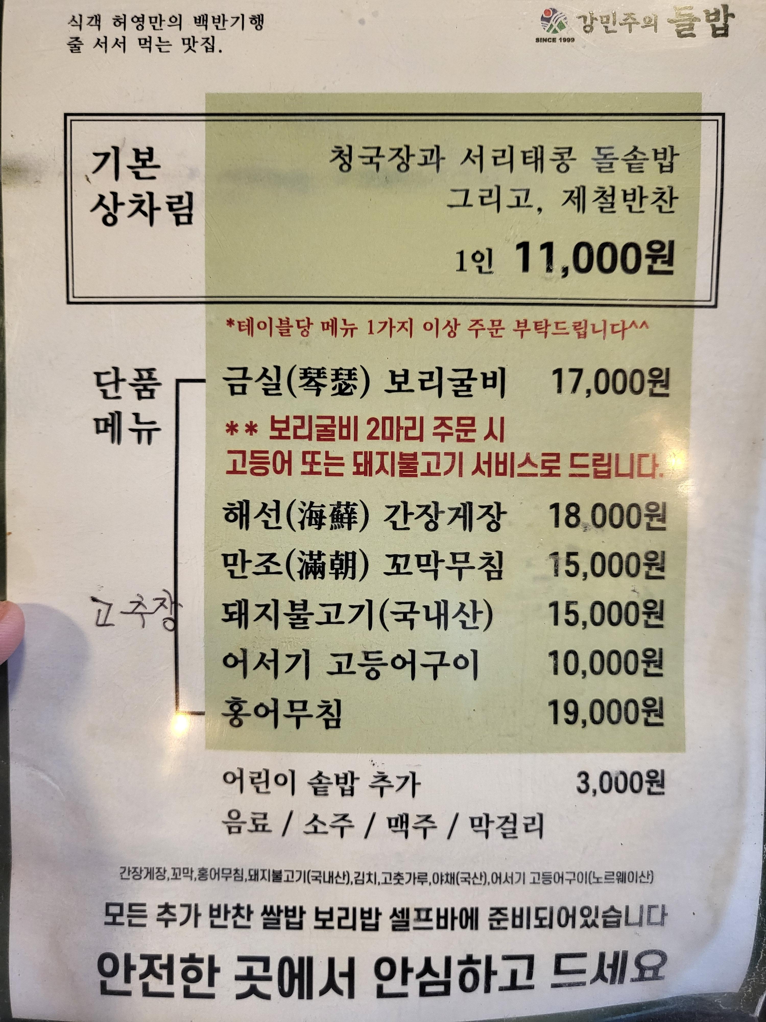 상차림으로 1인당 11,000원이고 청국장과 서리태콩 돌솥밥은 기본 그리고, 제철 반찬이 나온다고 합니다. 그 외 단품 메뉴로 보리굴비, 간장게장, 꼬막무침, 돼지불고기, 고등어구이, 홍어무침이 있는데 그중 평소에 자주 먹기 힘든 요리인 보리굴비를 시키자고 하셔서 상차림 3인분 그리고 보리굴비를 시켰습니다.