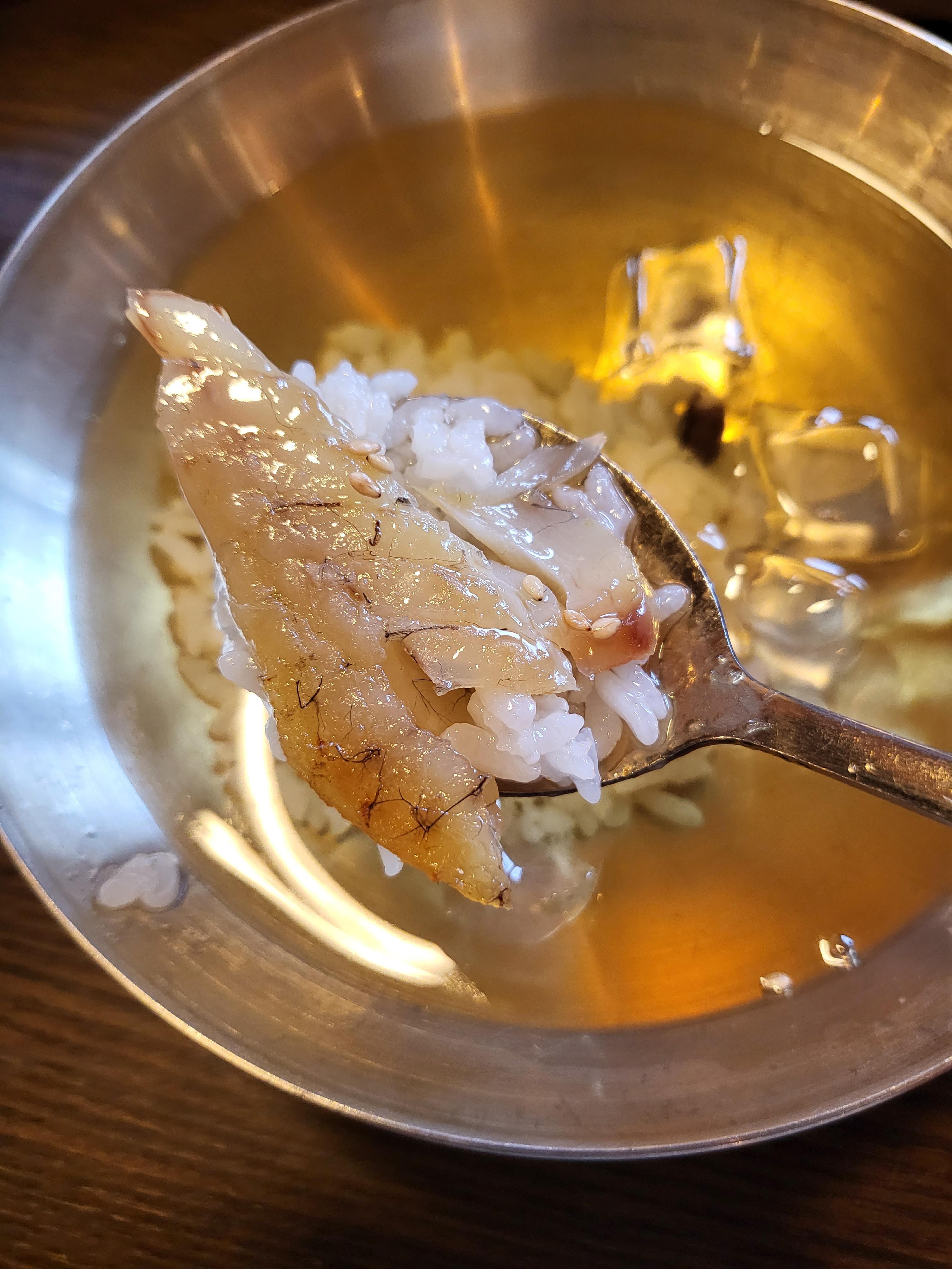 우선 빈 그릇에 음식 시킬 때 나눠준 얼음과 녹차물 부운 다음 돌솥밥을 넣어 말아주고 녹차물에 만 밥이랑 보리굴비를 얹어서 먹어보라고 하셔서 먹어보았는데 보리굴비의 짠맛을 정화시켜주고 얼음 때문에 밥이 시원해서 그런지 계속 씹다 보니 단맛도 나면서 맛있었습니다.