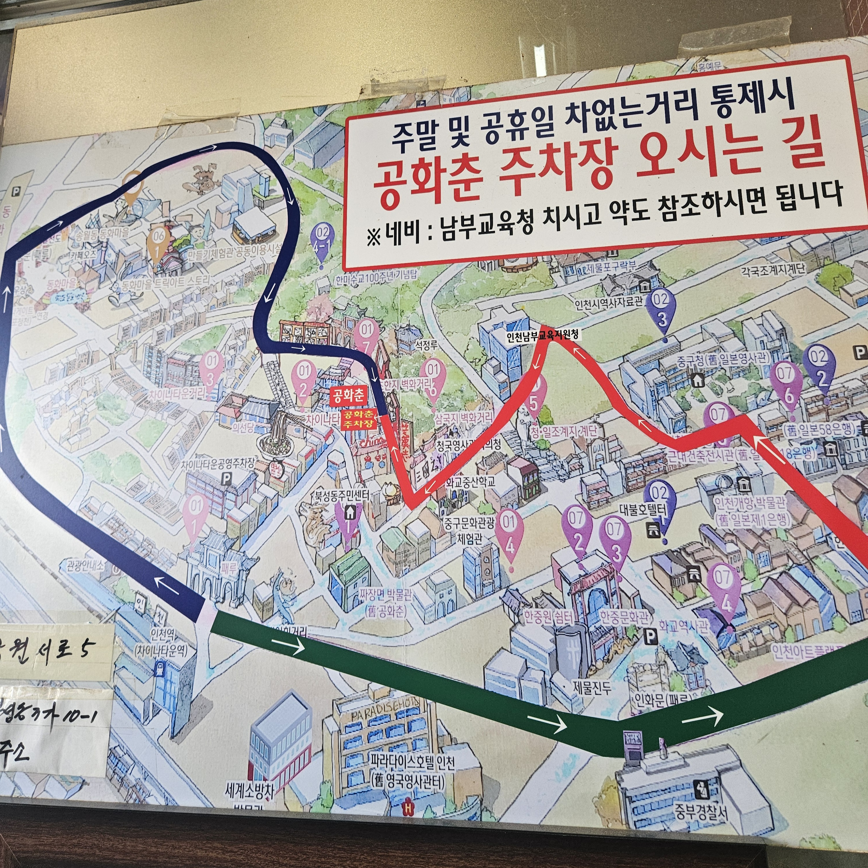 점심시간이라서 약 10-15분 정도 대기를 했는데요. 주말 및 공휴일에 차이나타운 주차장은 만석이니 공화춘 중식점을 방문할 계획이라면 밑에 표지판을 참고하시면 좋을 것 같아요.