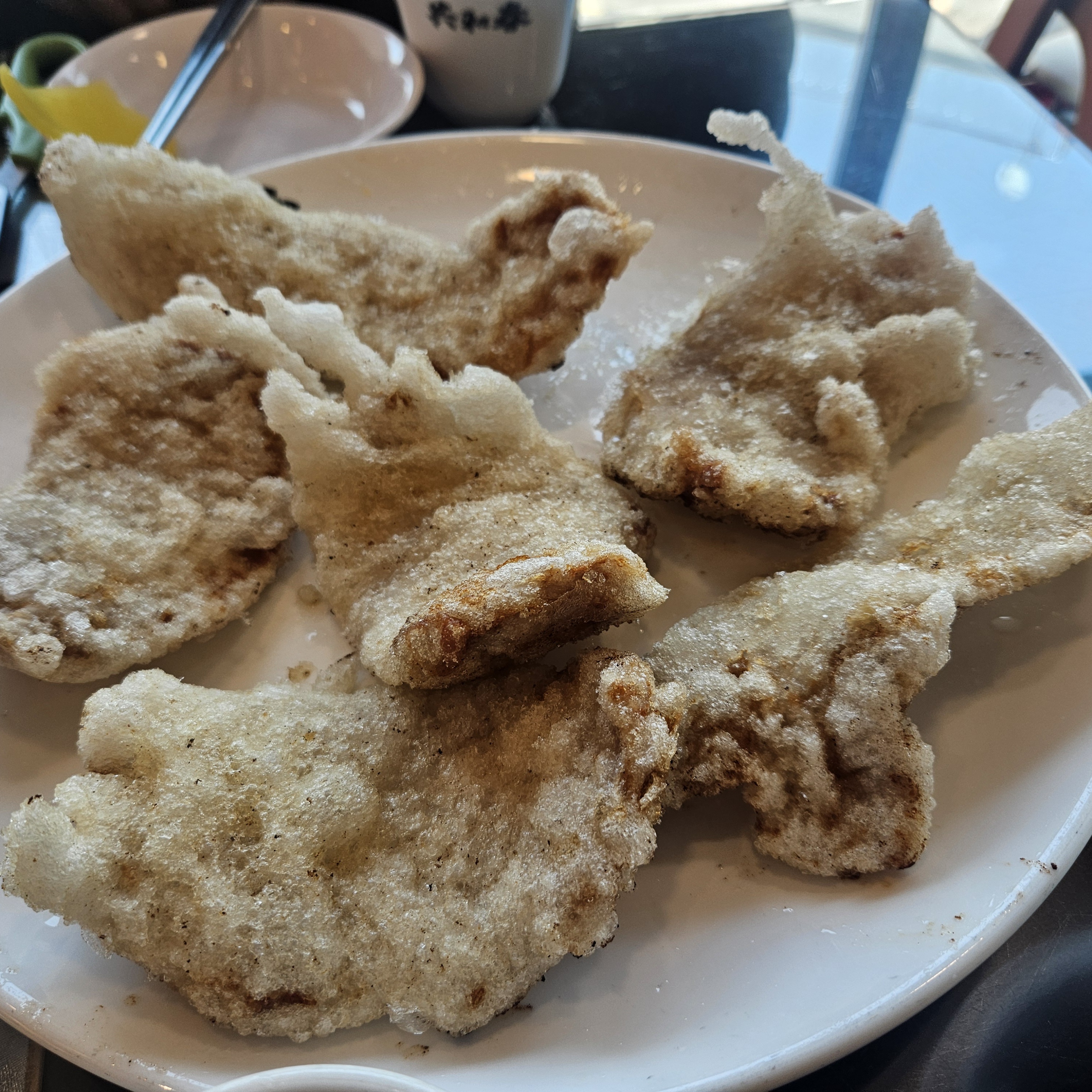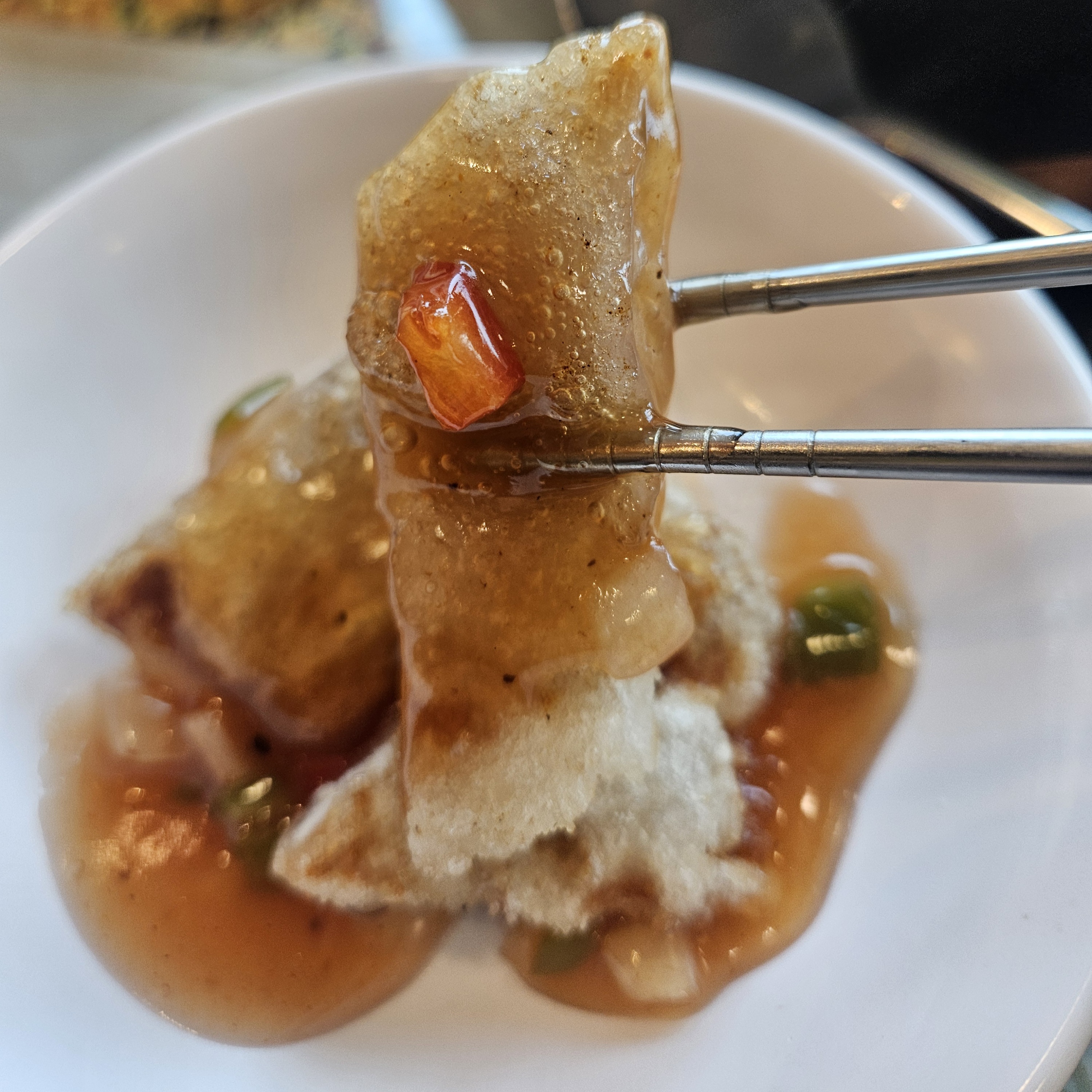 우선 주문한 음식 중 탕수육부터 나왔는데요. 꿔바로우처럼 넙적한 모양으로 튀긴 고기를 가위로 잘라서 먹는 형식이었습니다.