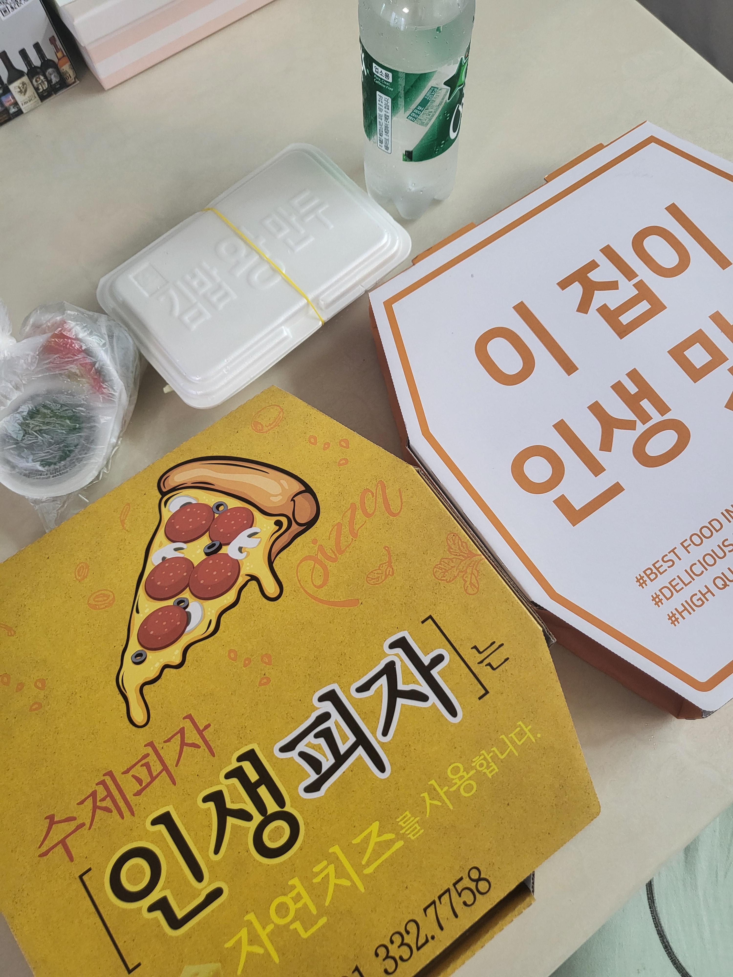 집 근처에서 배달주문한 인생피자 메뉴 중 치즈피자 및 훈제오븐구이통닭이 도착했는데요. 두 메뉴 다 피자 박스에 포장되어 왔고 치즈피자에는 치즈크러스트를 추가했고 훈제오븐구이통닭은 양배추샐러드까지 포함되어 있는 메뉴였습니다. 그리고 추가로 아들이 좋아하는 사이다도 주문을 했는데요. 그렇게 배달비까지 포함해서 39,000원이라는 금액을 결제했답니다.