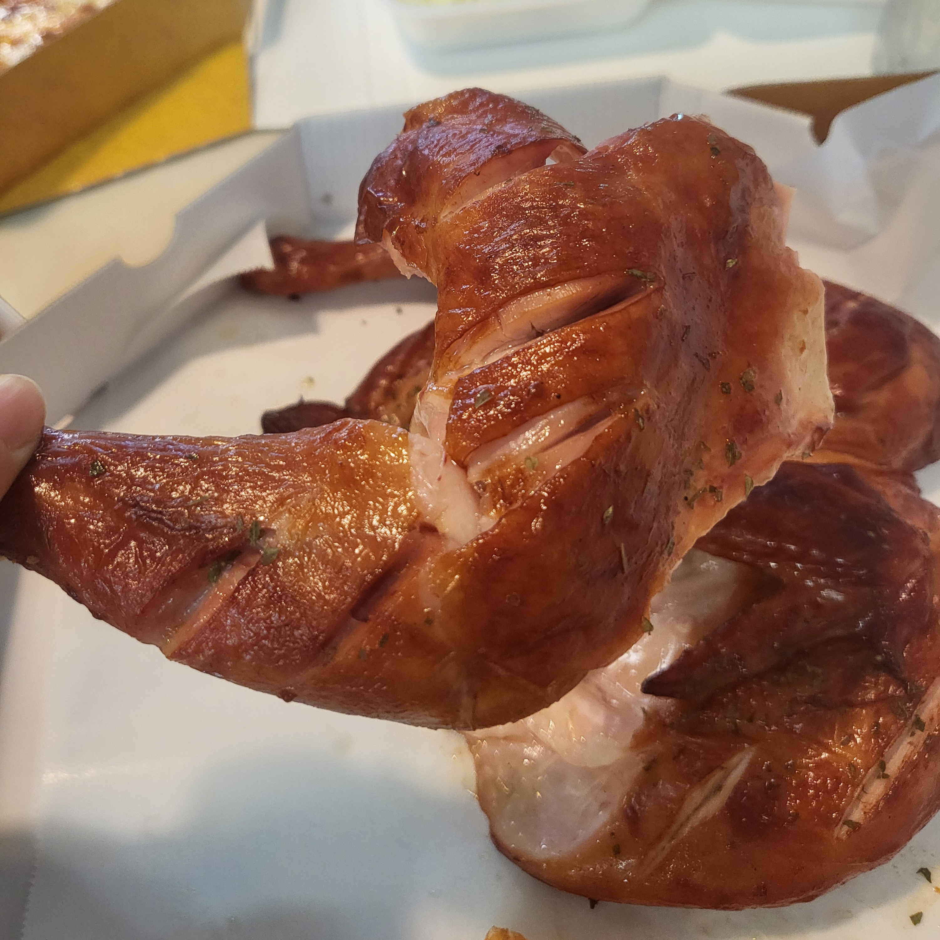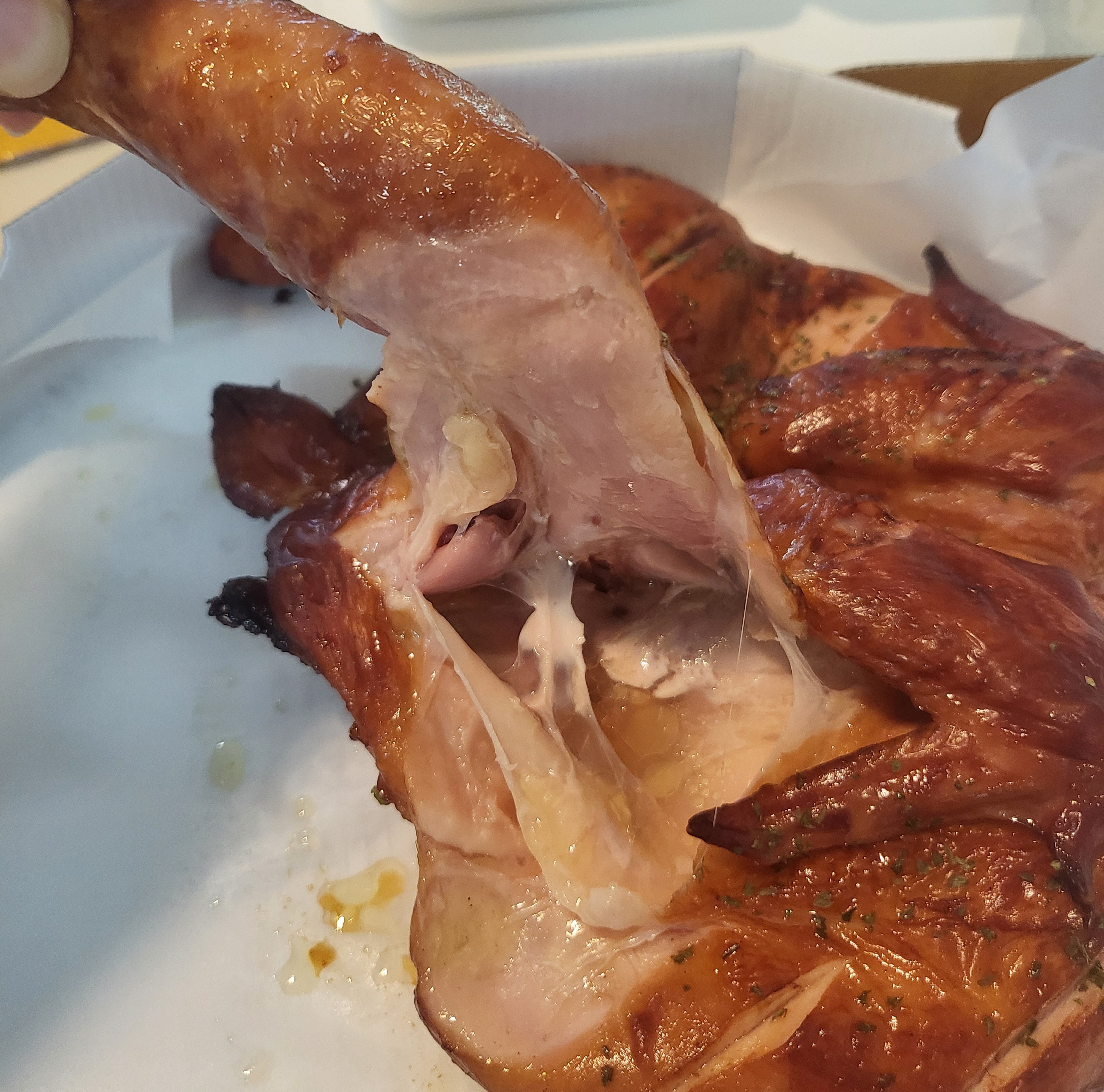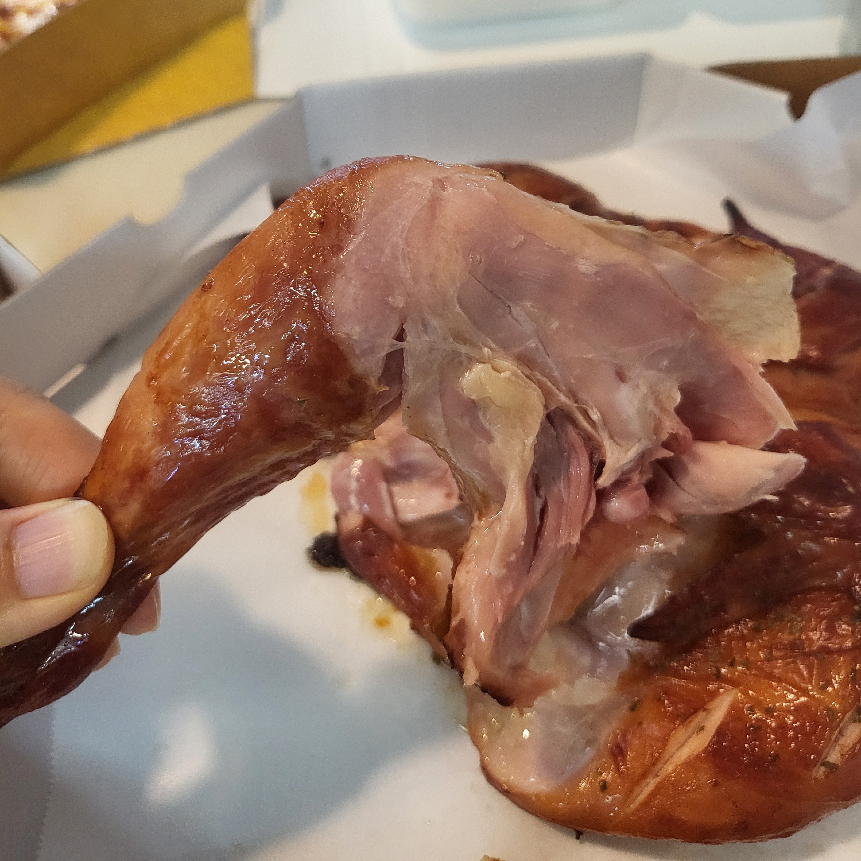 그리고 드디어 훈제오븐구이통닭을 먹어보기 위해 다리살부터 뜯어보았는데요. 다리살 뜯어지는 거 보이시나요? 어찌나 부드럽게 살이 뜯어지던지 먹을 때 엄청 부드럽게 씹힐 것 같더라고요.
