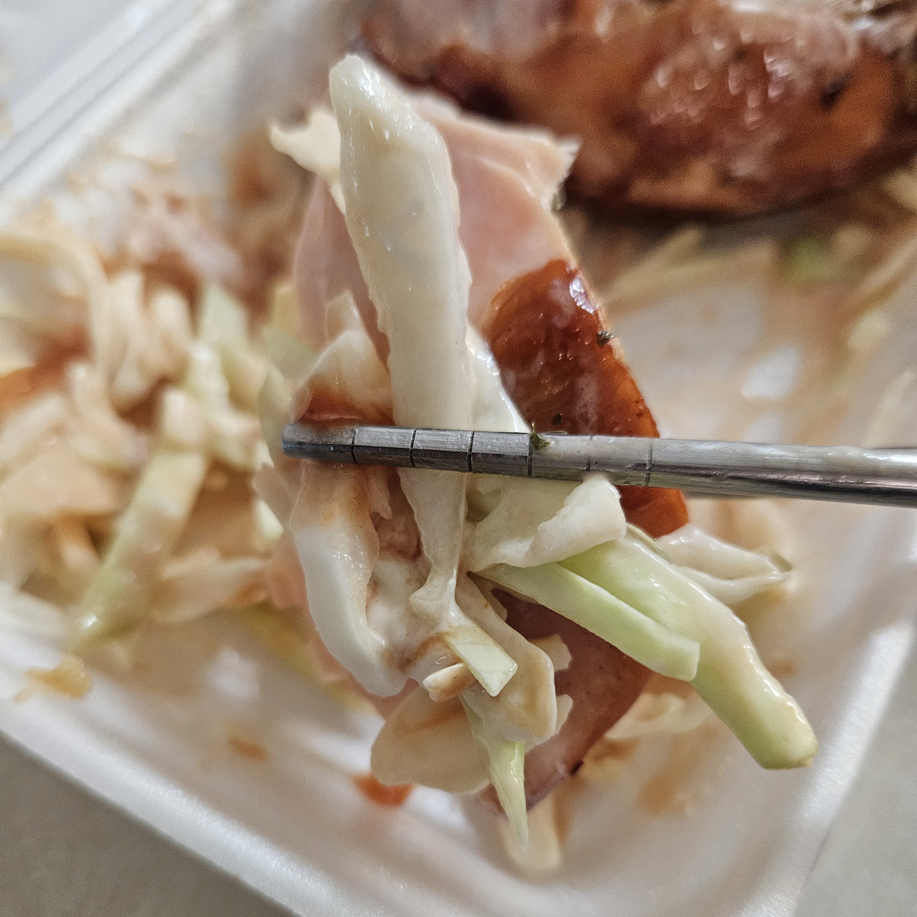 그리고 훈제오븐구이통닭 또한 양배추랑 먹으니 양배추의 아삭아삭함과 케첩 및 마요네즈 소스의 달달함이 어우러져 더 맛있게 먹을 수 있었답니다.