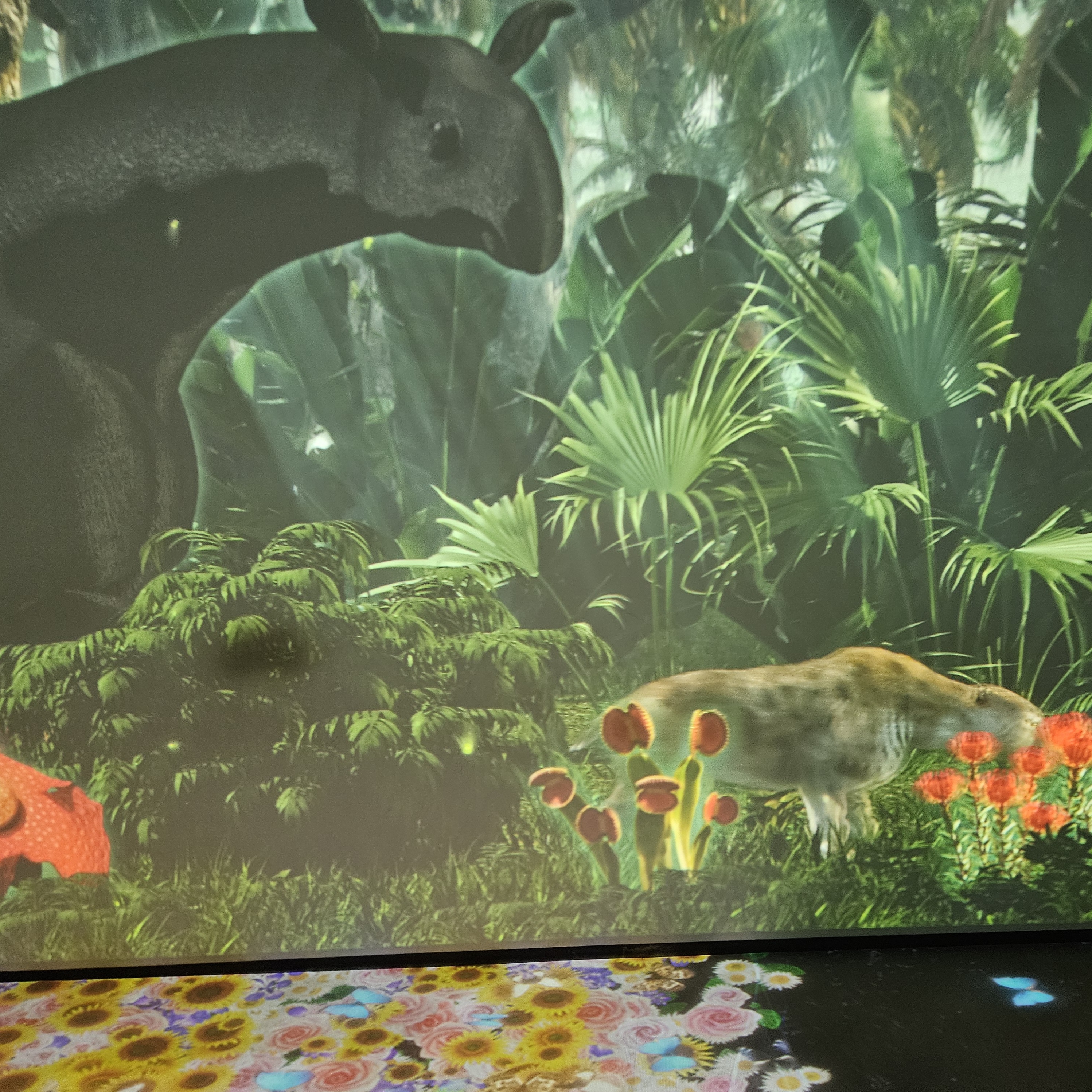 정글로 되어있는 스크린을 터치하면 반딧불이가 반짝거리면서 동물들이 움직이는데 신기하더라고요. 하지만 아들은 관심이 없는지 바로 도망갔답니다.