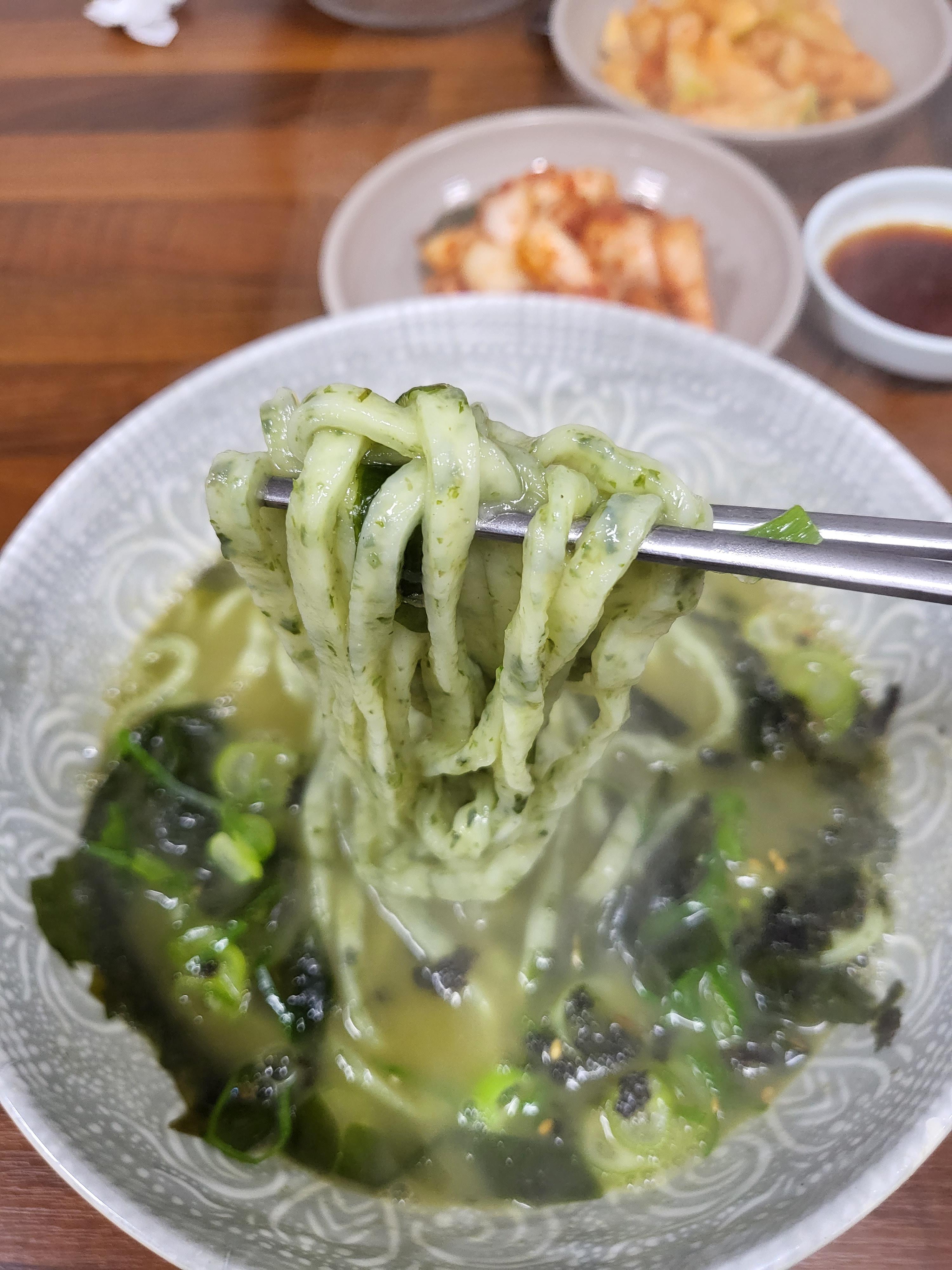 마지막으로 진짜 메인 메뉴인 보말칼국수가 드디어 나왔습니다. 보말칼국수 또한 미역과 파래를 갈아서 만들어서 그런지 면색이 초록색으로 푸릇푸릇했는데요. 국물 건더기에도 미역이 들어가고 면에도 미역이랑 파래가 들어가서 그런지 미역국 맛이랑 거의 흡사했지만 국물이 미역국보단 찐한 게 정말 맛있었습니다. 면 또한 쫄깃쫄깃하고 미역이랑 같이 먹으면 식감도 더해져 맛있더라고요. 저는 고추를 넣어 조금 매콤하게 먹었는데 정말 맛있었습니다.