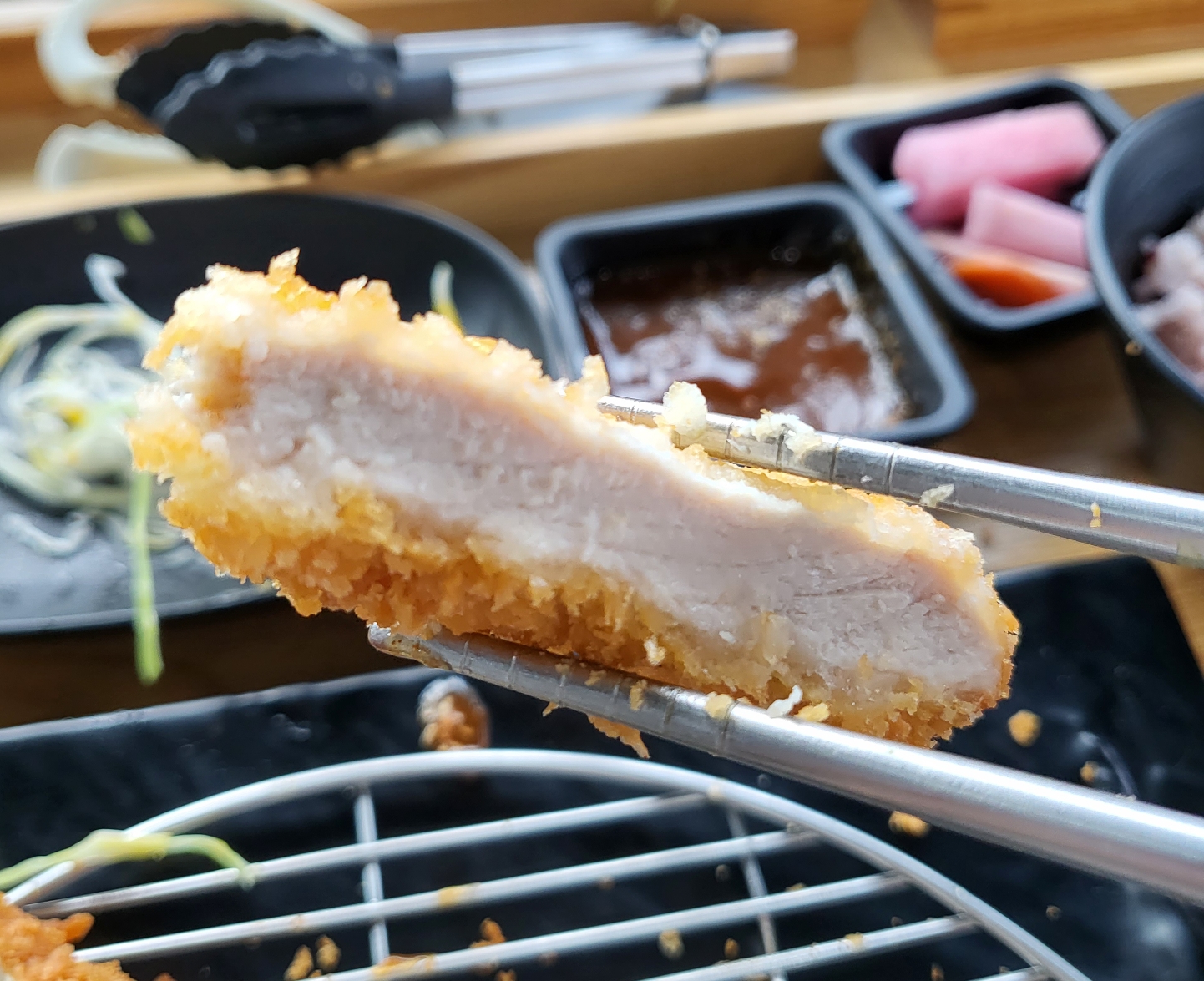 체감상으로 약 10분에서 15분 정도 기다렸을까요? 주문한 음식이 나왔습니다. 일단 흑돼지 수제 돈가스부터 먹어보았는데요. 정말 맛있더라고요. 흑돼지를 사용해서 그런지 고기는 부드럽고 튀김옷도 바삭한 게 상상이상이었습니다. 기대를 크게 안 하고 먹어서 그런 건지 모르겠지만 맛은 기대 이상었는데요.