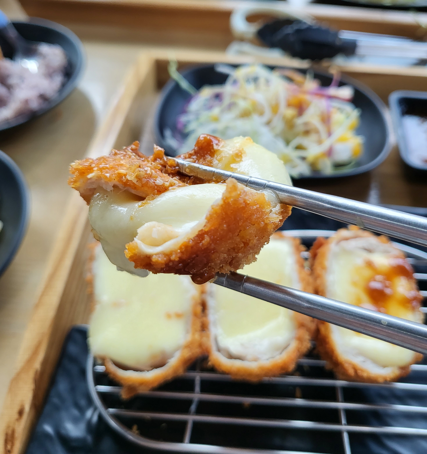 그다음은 흑돼지 치즈돈가스를 맛보았습니다. 개인적으로 치즈를 좋아한다면 치즈 돈가스 강추 정말 맛있습니다. 치즈 씹히는 식감이랑 튀김 식감이 정말 강추하고 싶네요 사진도 보이시나요? 제가 사진을 잘못 찍는데 사진으로 보아도 맛있게 보이지 않나요?? 개인적으로 흑돼지 치즈돈가스를 제일 맛있게 먹었답니다.