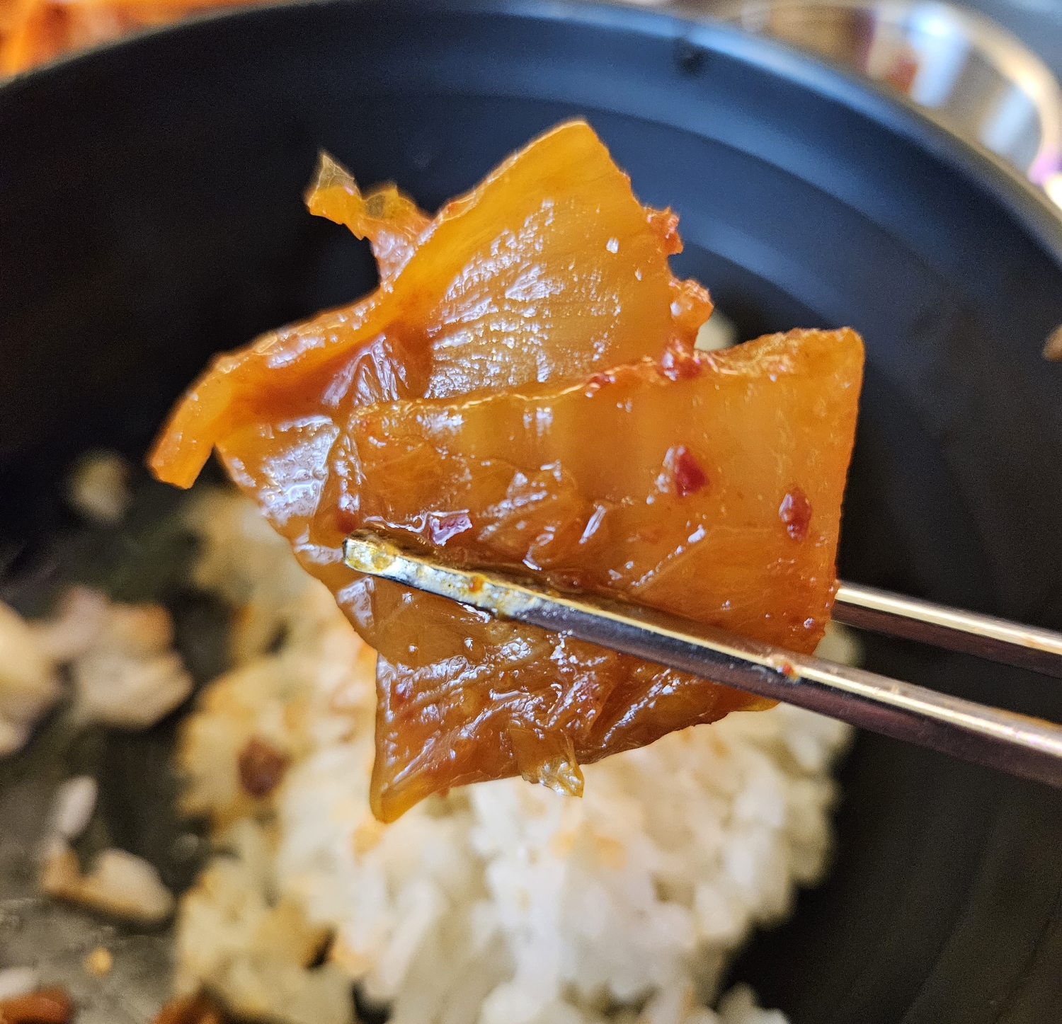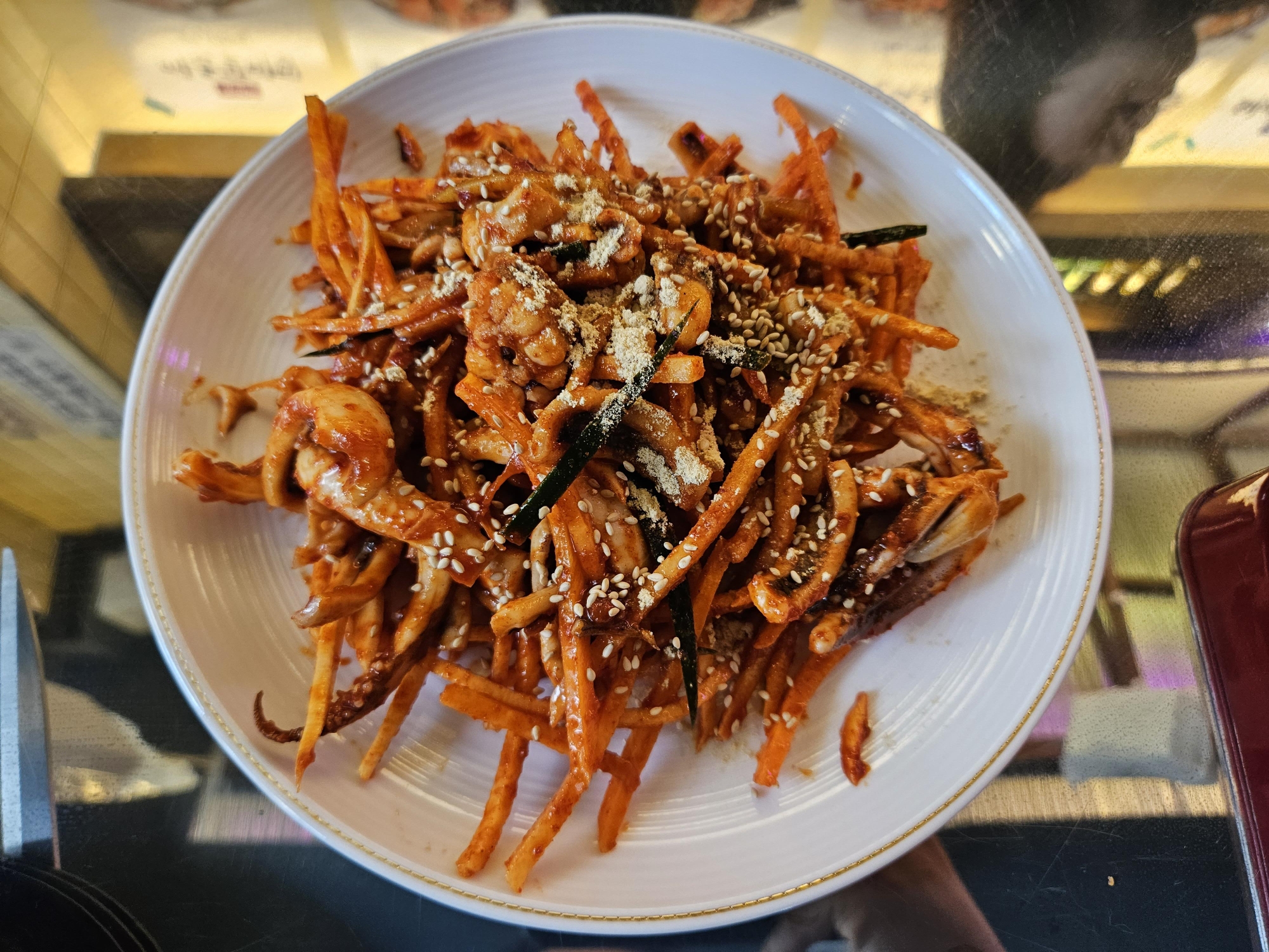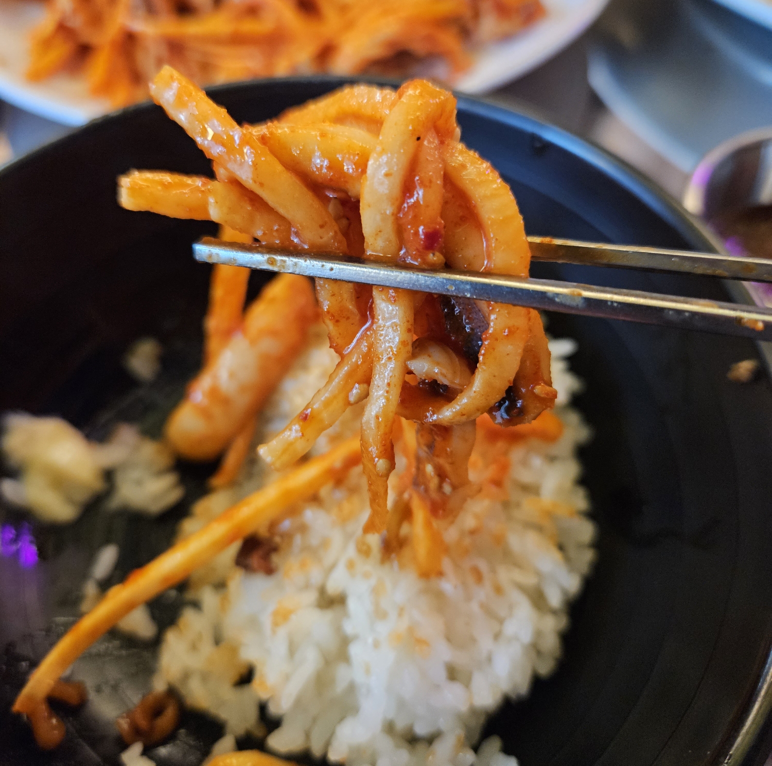 우선 오징어초무침부터 먹어보았는데요 양념은 초고주창 베이스 오징어 씹히는 식감 플러스 야채에 아삭함이 더해져 맛있더라고요 아는 맛이 무섭다고 오랜만에 먹어서 그런지 맛있었습니다