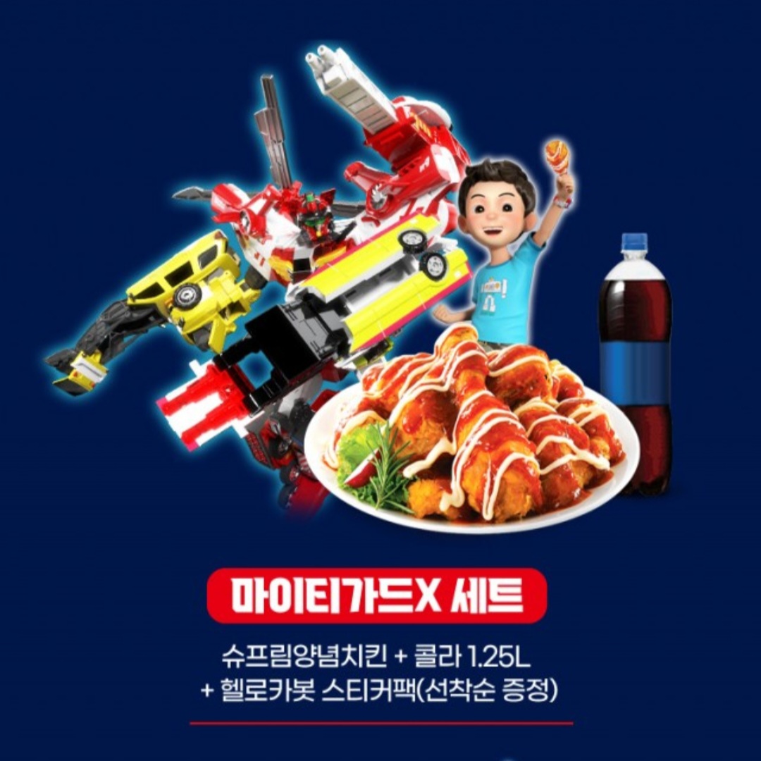 헬로카봇X 치킨 세트 종류는 총 3가지로 마이티가드X 세트는 슈프림양념치킨 + 콜라 1.25L+헬로카봇 스티커(선착순) 증정