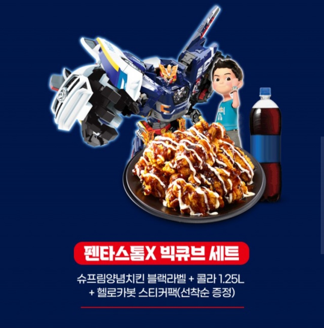 펜타스톰X 치킨 세트는 슈프림양념치킨 블랙라벨+콜라 1.25L+헬로카봇 스티커(선착순) 증정