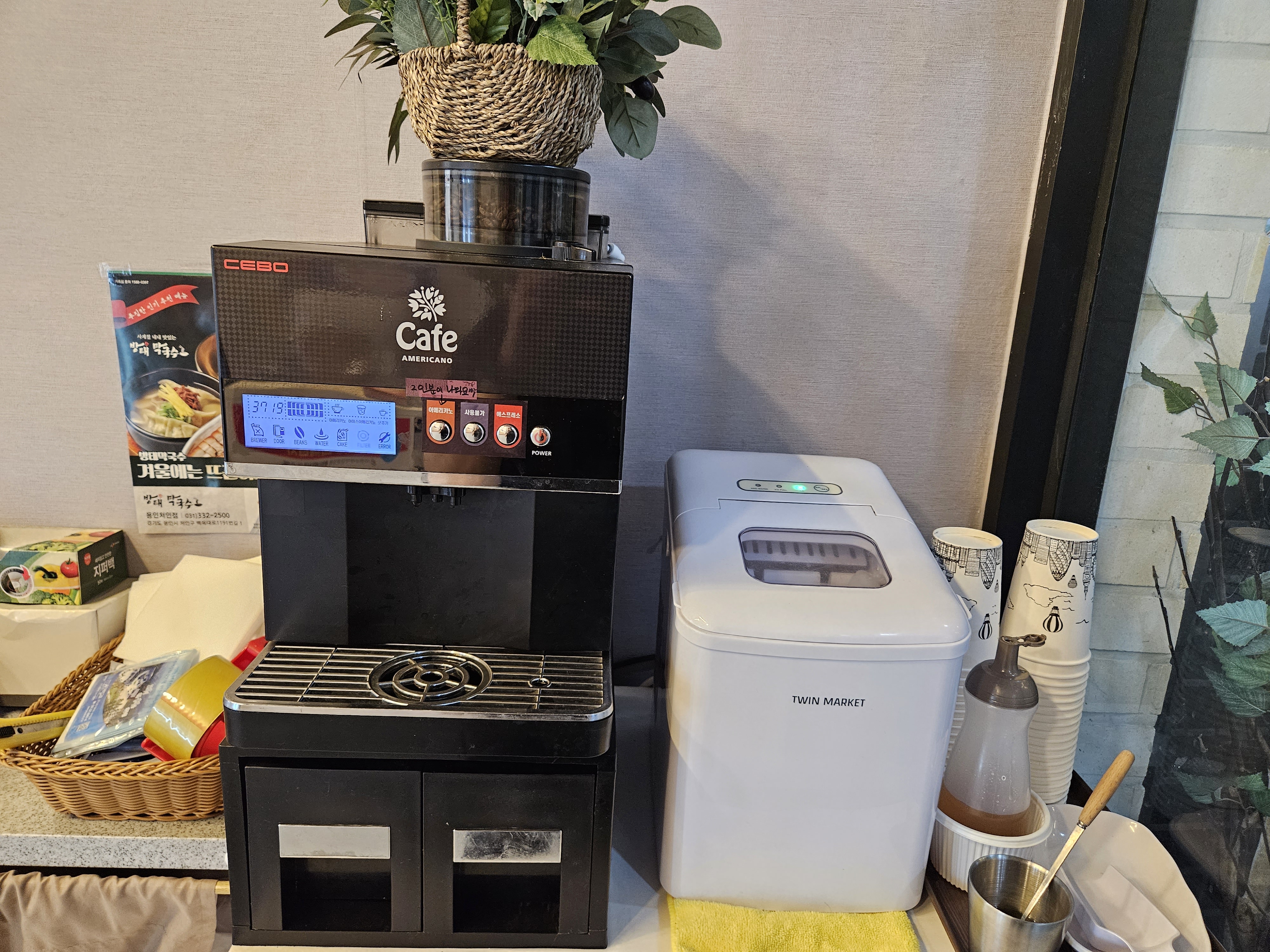 저는 매실차를 먹어보았는데 사이다 혹은 탄산수를 조금 섞었는지 톡 쏘는 맛이 느껴져서 맛있더라고요. 그리고 와이프는 아메리카노를 뽑아서 먹었는데 양이 장난 아니었습니다. 얼음을 담고 에스프레소를 뽑아서 아이스 아메리카노로도 먹을 수 있으니 참고해 주세요.