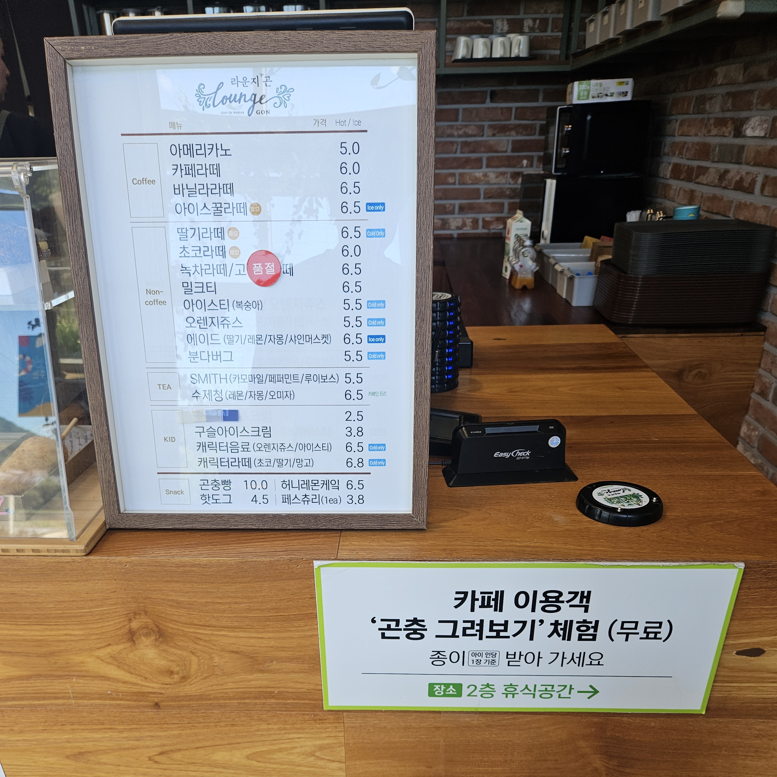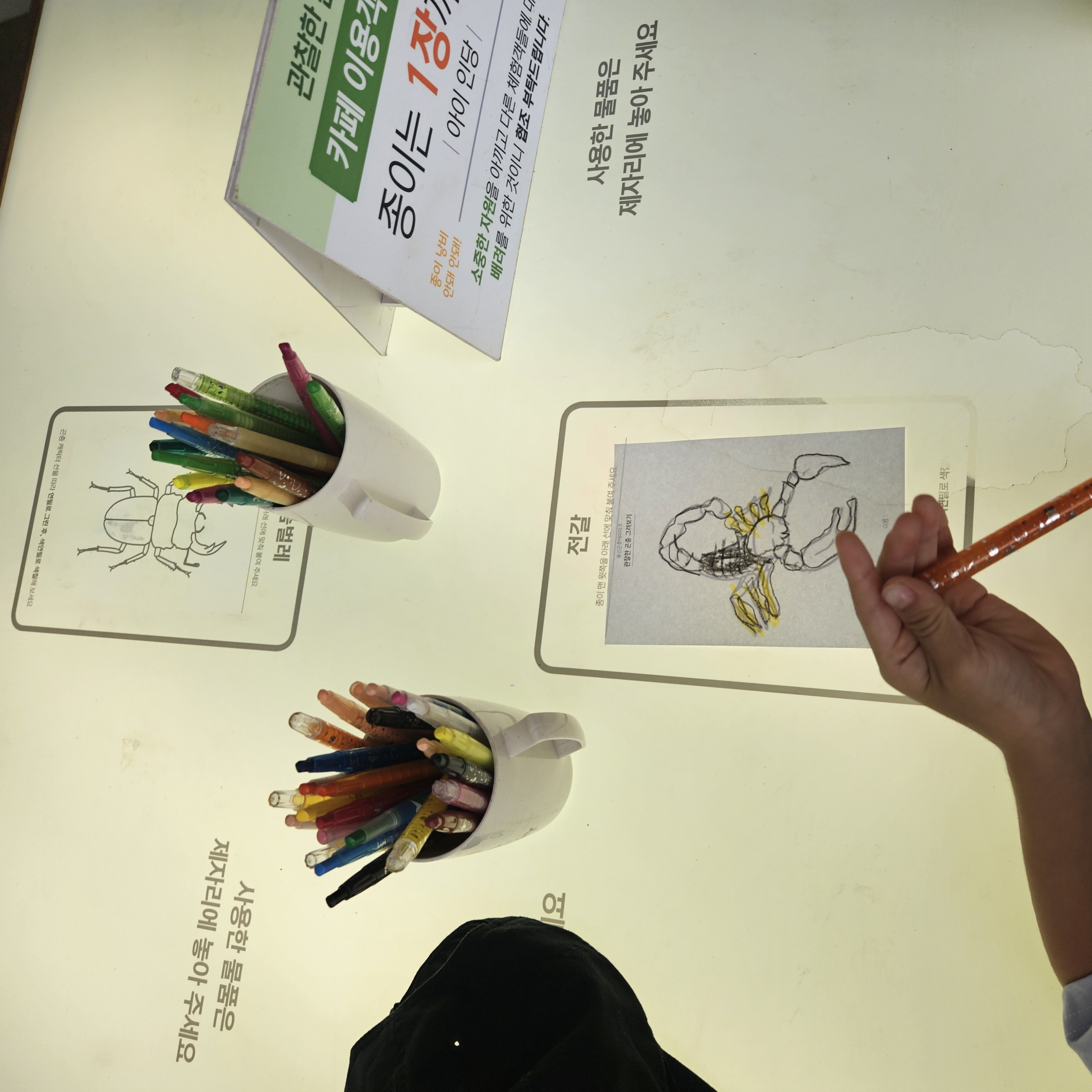 그리고 바로 옆 카페에는 곤충 그리기 체험을 할 수 있는 종이를 주는 곳도 있었는데요. 카페 이용을 해야지만 종이를 받을 수 있다길래 곤충빵 및 음료를 주문해 2층에서 그림 그리기 체험도 했답니다.