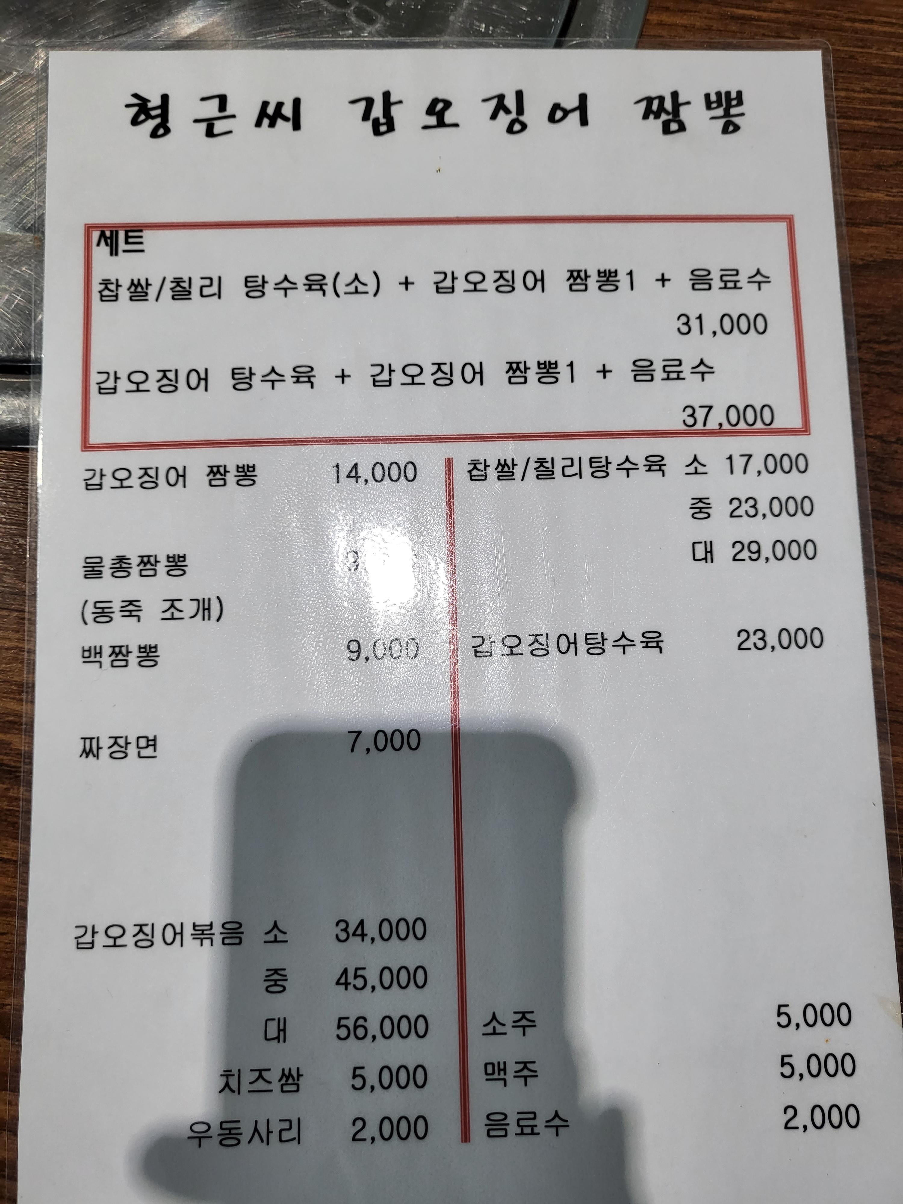 형근씨 갑오징어 짬뽕 메뉴판은 정말 간단하게 구성되어 있었습니다. 세트 코스 두 종류에 짬뽕 종류 및 짜장면 갑오징어 요리로만 구성되어 있는데 저랑 마눌님이랑 고른 메뉴는 세트 코스 첫 번째 31,000원짜리를 주문해서 시켜 먹어 보았습니다.