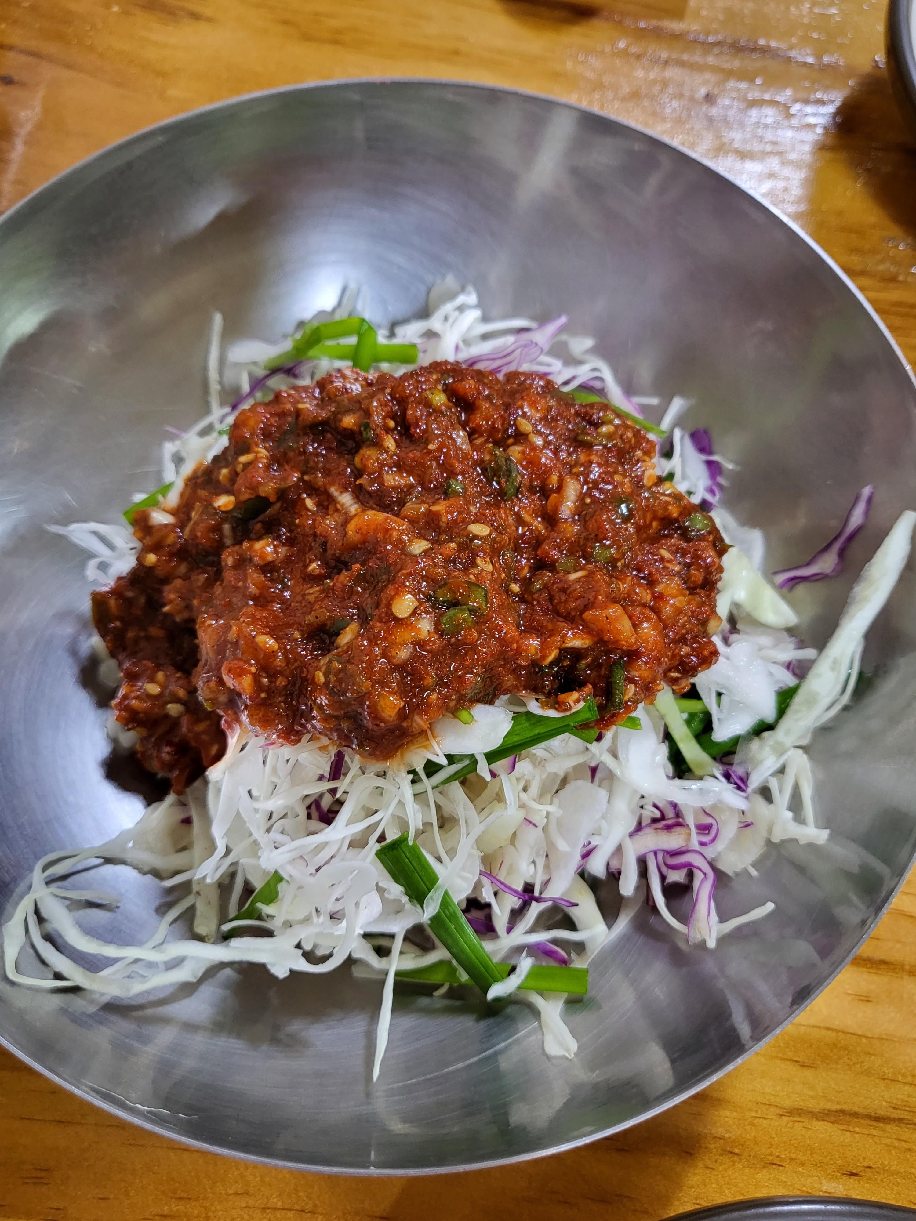 그리고 닭한마리 칼국수 전용 밑반찬으로 특제소스가 추가된 야채가 나오는데요. 여기에 닭육수 반국자를 넣어 잘 섞어 먹으면 더 매콤, 새콤, 달콤한 맛을 느껴볼 수 있다고 가게 직원이 말씀해주셔서 닭육수를 넣어 먹었는데 맛있었습니다.