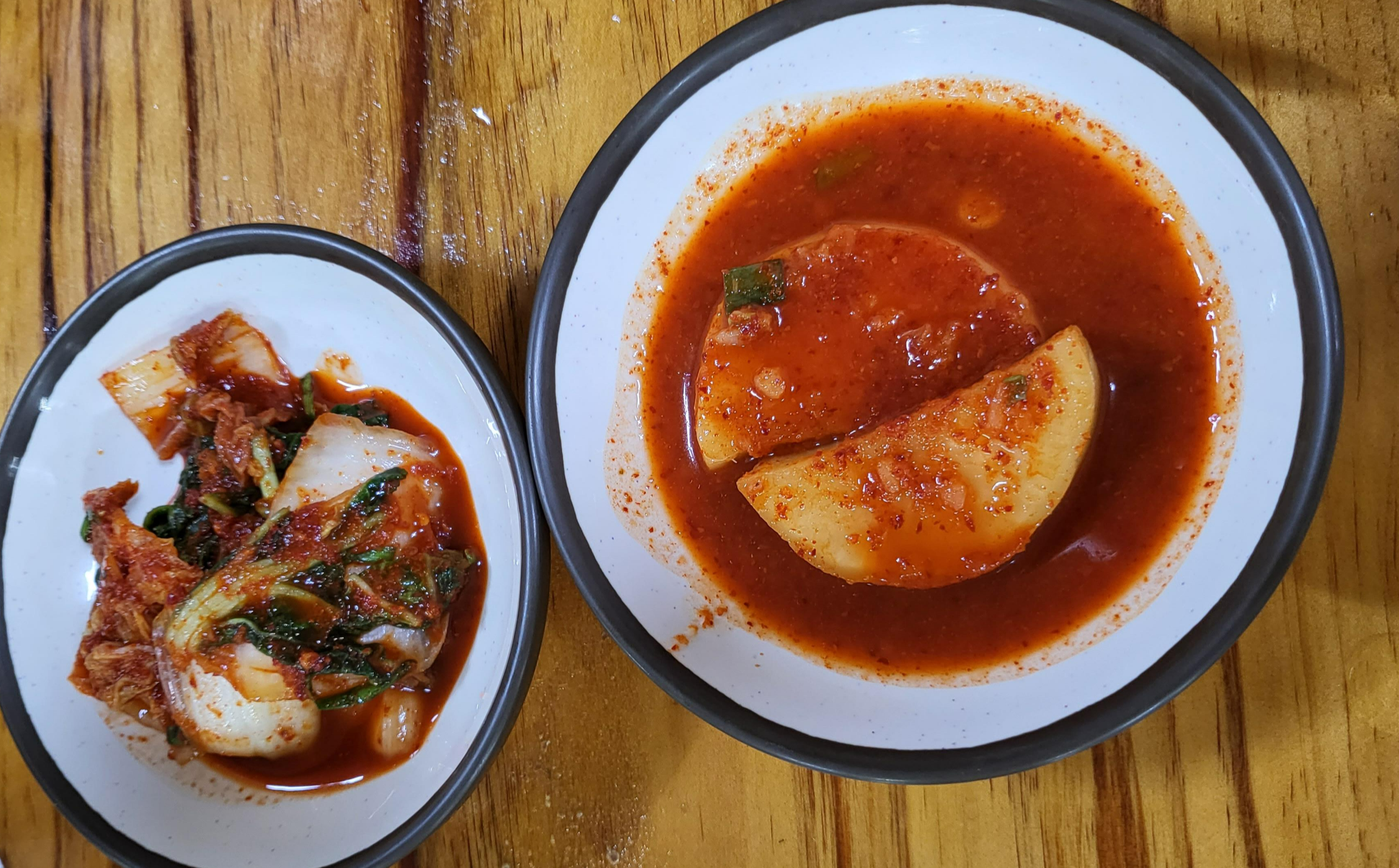 주의사항으로 닭한마리 칼국수는 추가 주문이 불가능하고 그외 닭개장, 닭곰탕, 칼국수 메뉴를 시킬땐 테이블당 2가지 메뉴이상 시키면 안된다고 메뉴판에 적혀있었습니다. 주말(공휴일)에는 손님이 많아서 홀/주방 인원이 부족해서 이러한 규칙을 만들지 않았나싶습니다. 닭한마리 칼국수를 시키니 반찬으로 정말 심플하게 배추김치, 깍두기가 나옵니다.