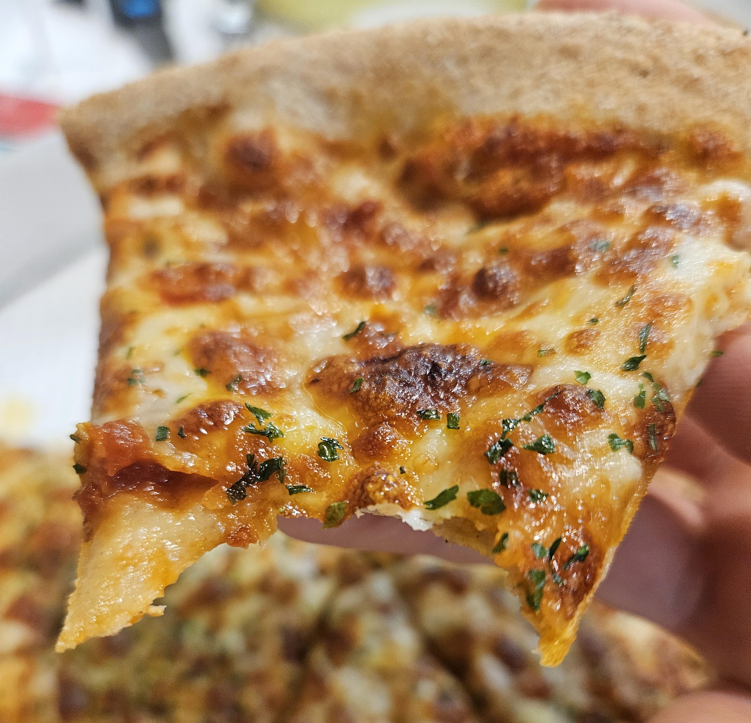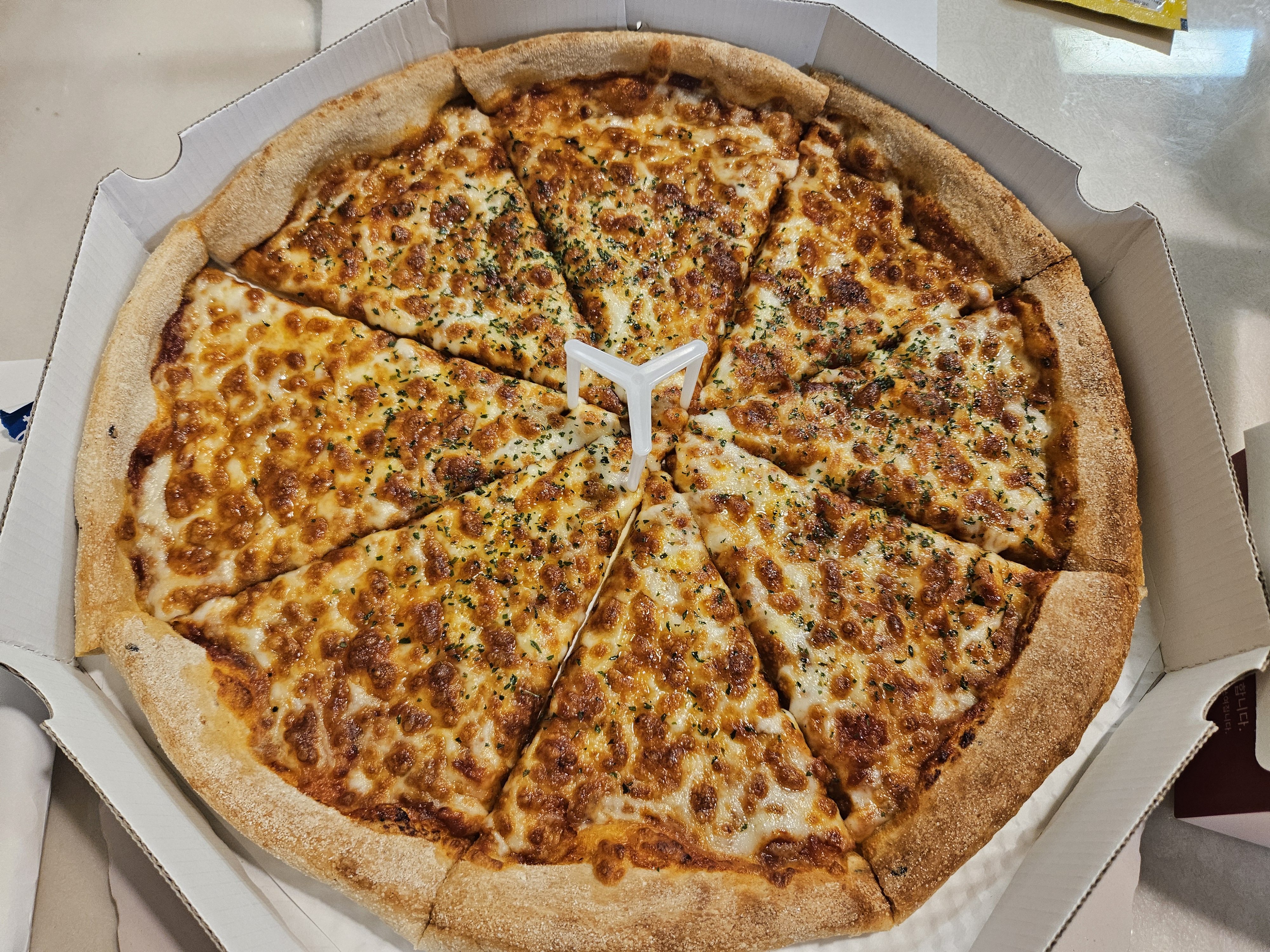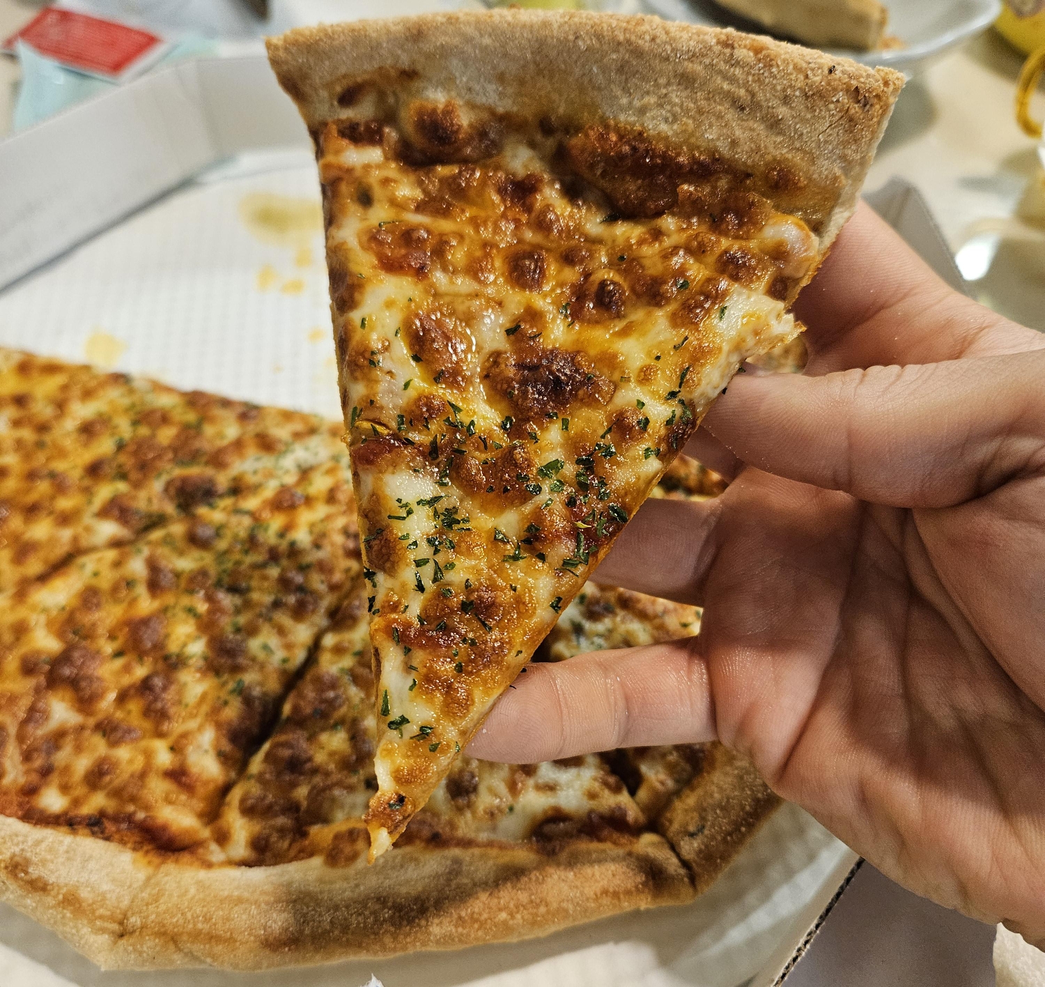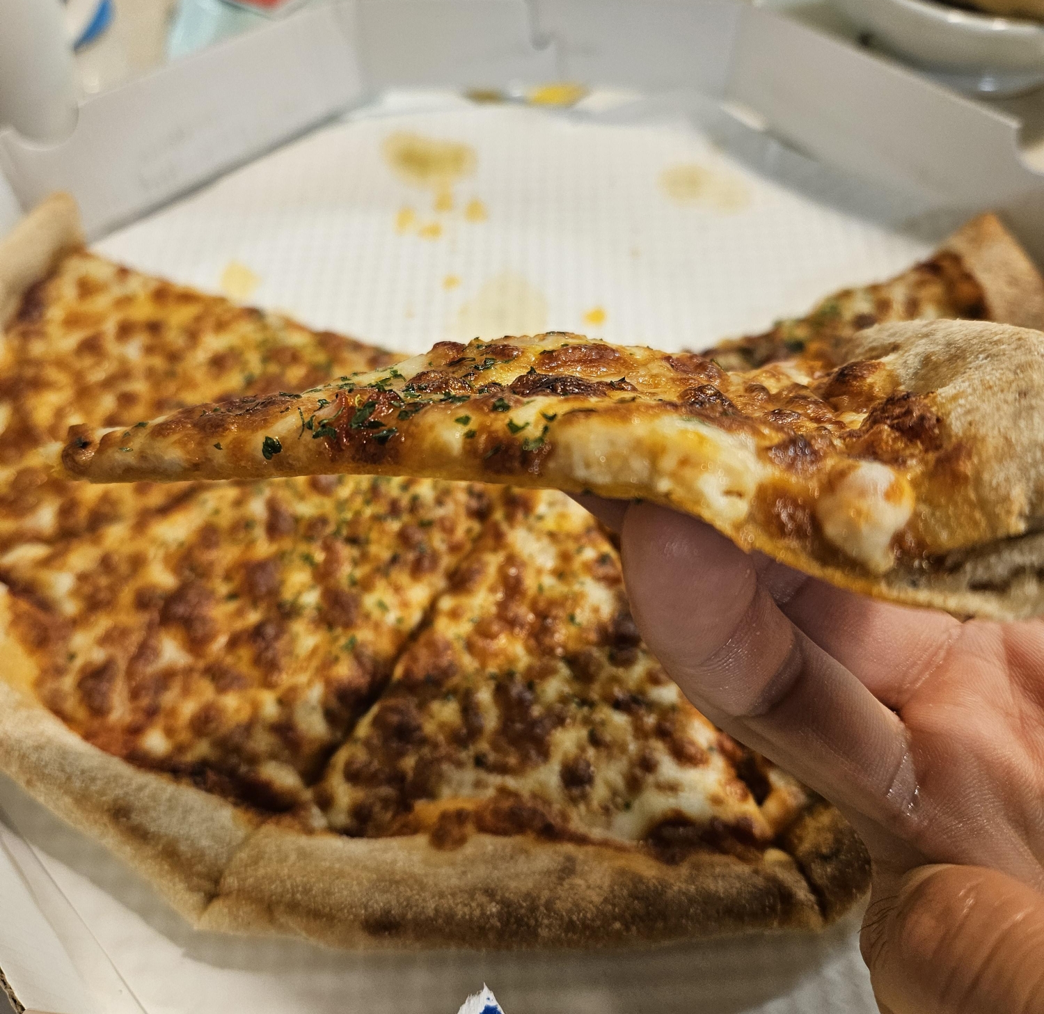 두께는 그렇게 두툼한 편은 아니었지만 그래도 기본 치즈피자치곤 두툼한 편에 속한다고 해야 할까요? 크기도 적당했지만 건장한 남자가 마음만 먹으면 한 판 다 먹을 수 있지 않을까라는 생각도 들었습니다.
