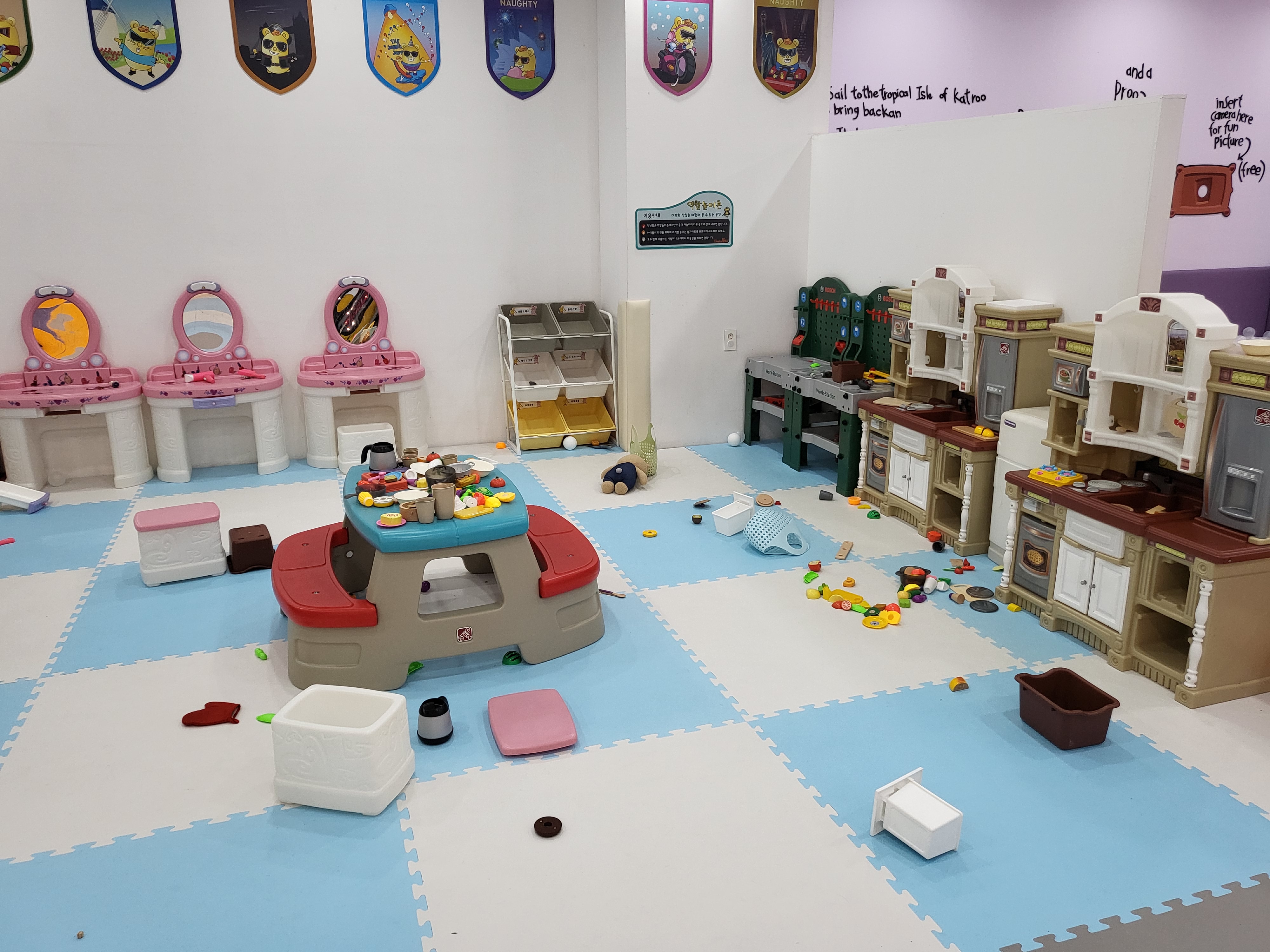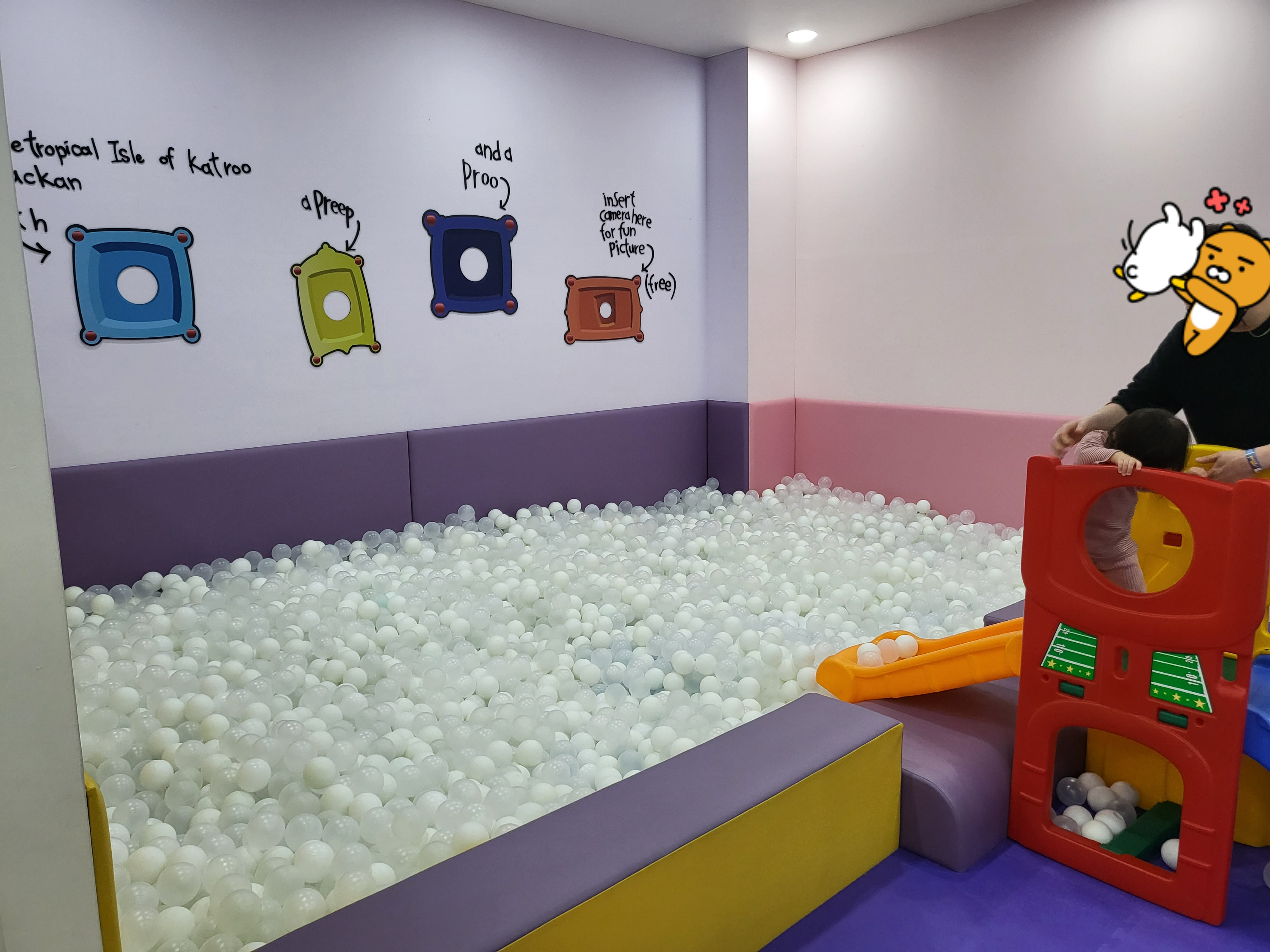 그리고 작은 미끄럼틀에 볼풀장까지 있어 이제 막 걷기 시작하는 아이들이나 활동적이지 않은 36개월 미만 아이들이 놀기에 딱 좋아 보였고 한쪽에는 소꿉놀이 할 수 있는 장난감까지 저희 아들은 잠깐 둘러보더니 벽에 붙어있는 자동차 한번 만져보고 딴 데로 가더라고요.