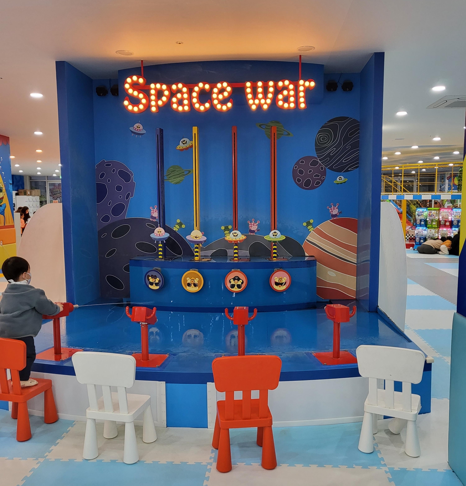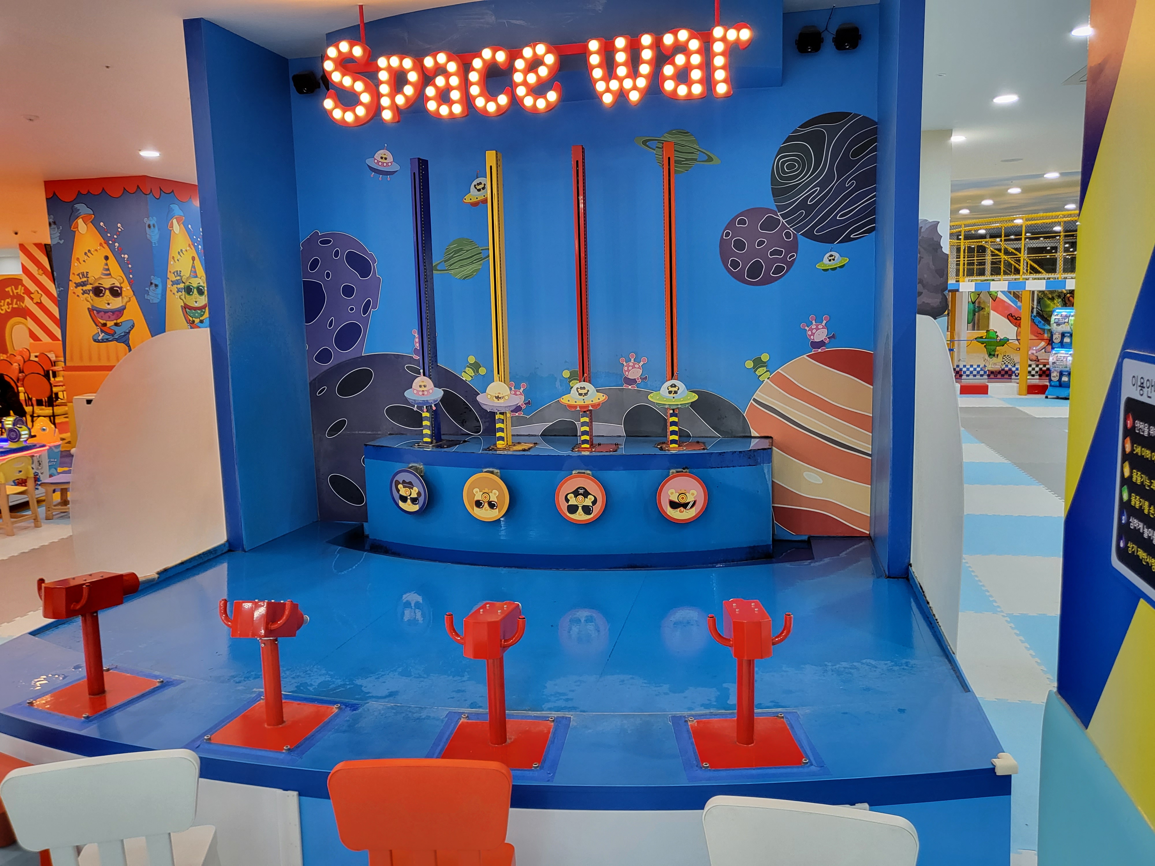 한켠에는 물총놀이를 할 수 있는 공간도 있는데요. 우주전쟁이라고 해서 의자에 앉아 물총으로 캐릭터 이마 쪽에 있는 과녁을 맞히면 우주선이 위로 쭉 올라가는 게임인데요.
