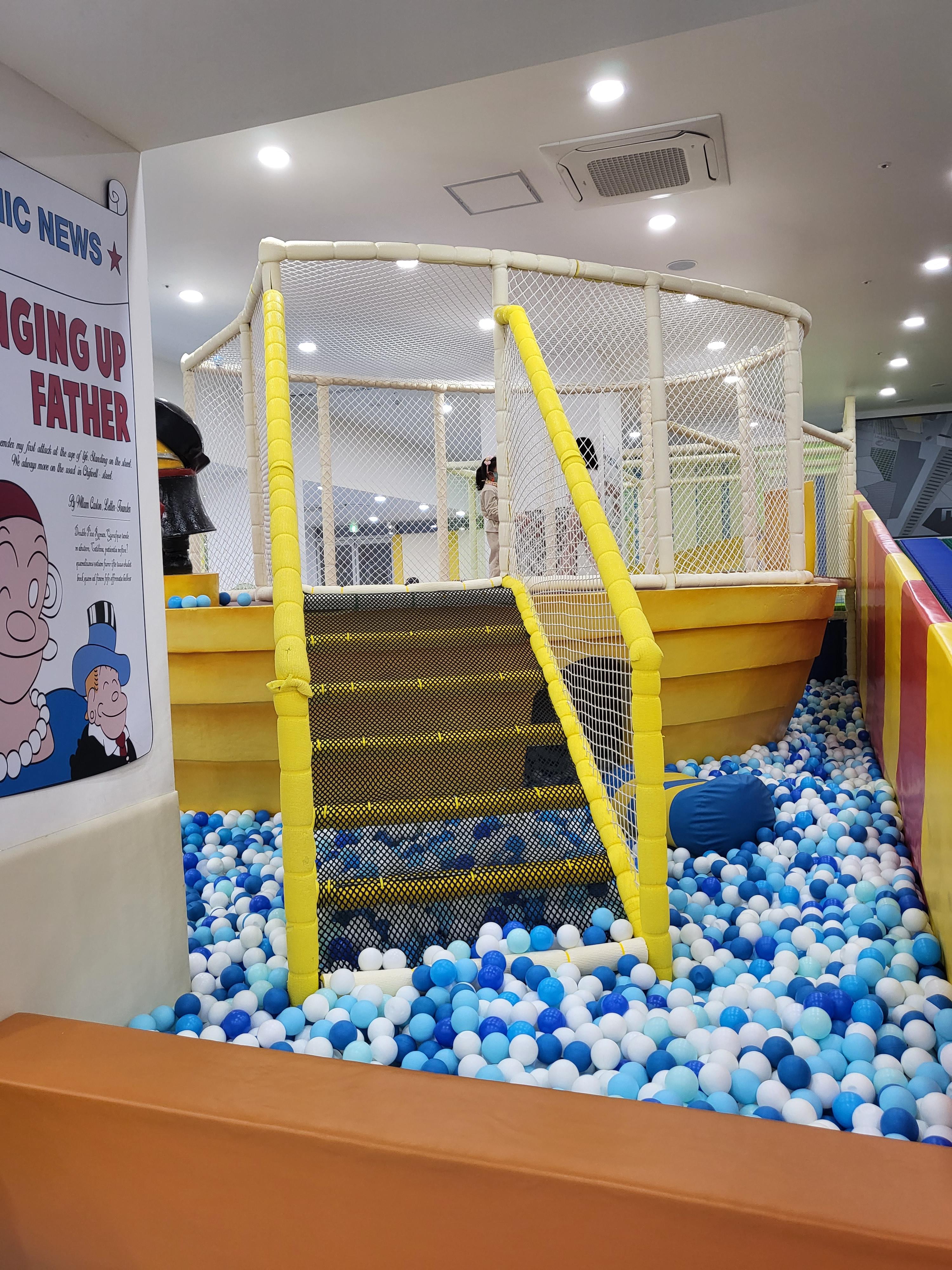 키즈카페 가면 꼭 있는 공풀장 대규모 키즈카페인만큼 제가 가본 키즈카페 중 제일 큰 규모의 볼풀장이지 않나 싶은데요. 공풀장 위에는 배모양으로 되어 있고 미끄럼틀도 있어 많은 아이들이 공놀이하면서 놀고 있었고 배모양아래에는 구멍이 있는데 거기서 쉬고 계시는 부모님도 계시더라고요.