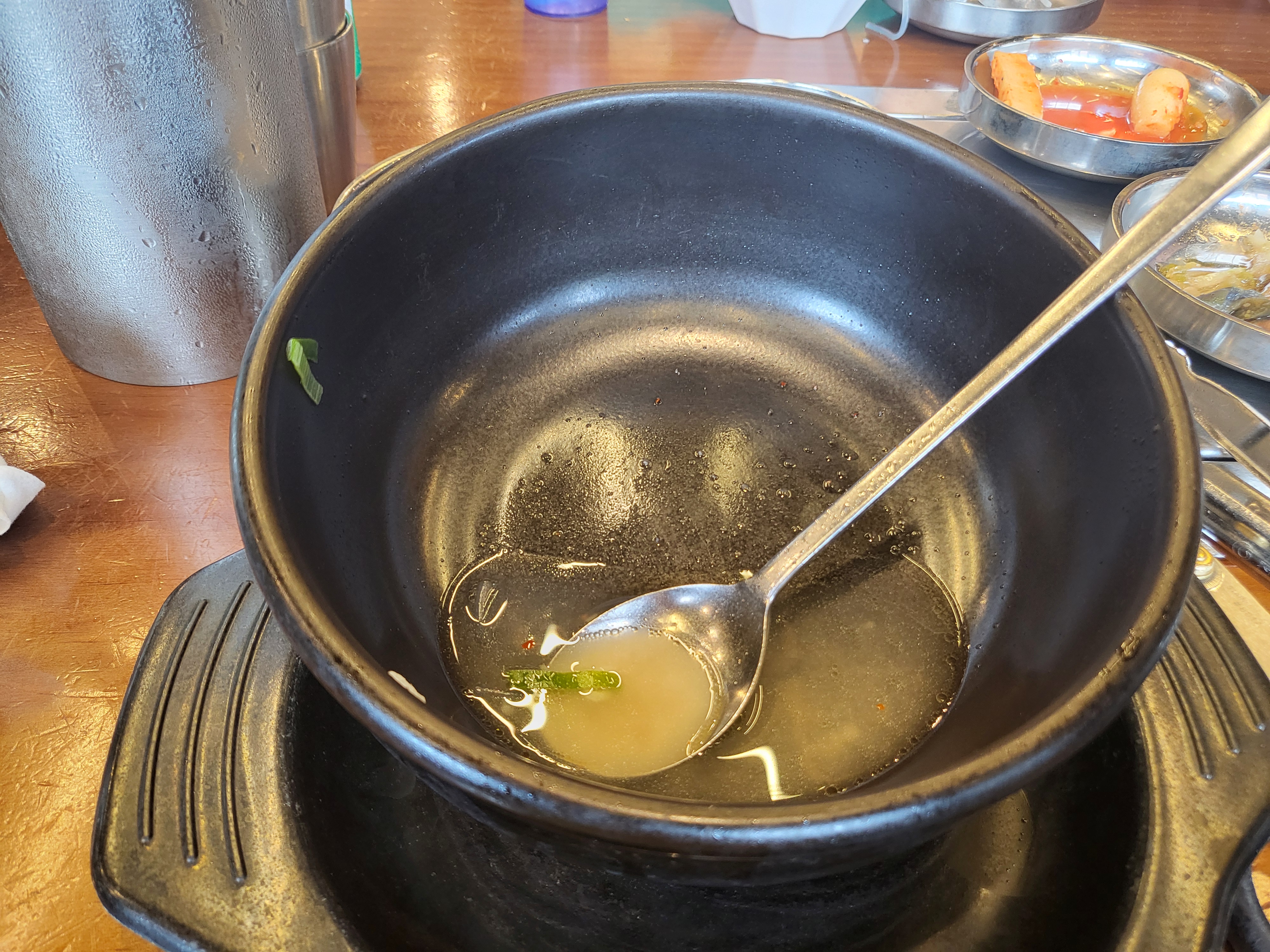 그렇게 더운 날씨에 땀 삐질삐질 흘리면서 한 그릇 뚝딱 다 먹었는데요. 에어컨도 들어져 있었는데 뜨거운 음식을 먹으니 땀이 한 바가지가 나오더라고요. 밥 종류를 먹고 싶어 방문한 거였는데 역시 여름에는 시원한 음식을 먹어야 했었나 봐요. 하하