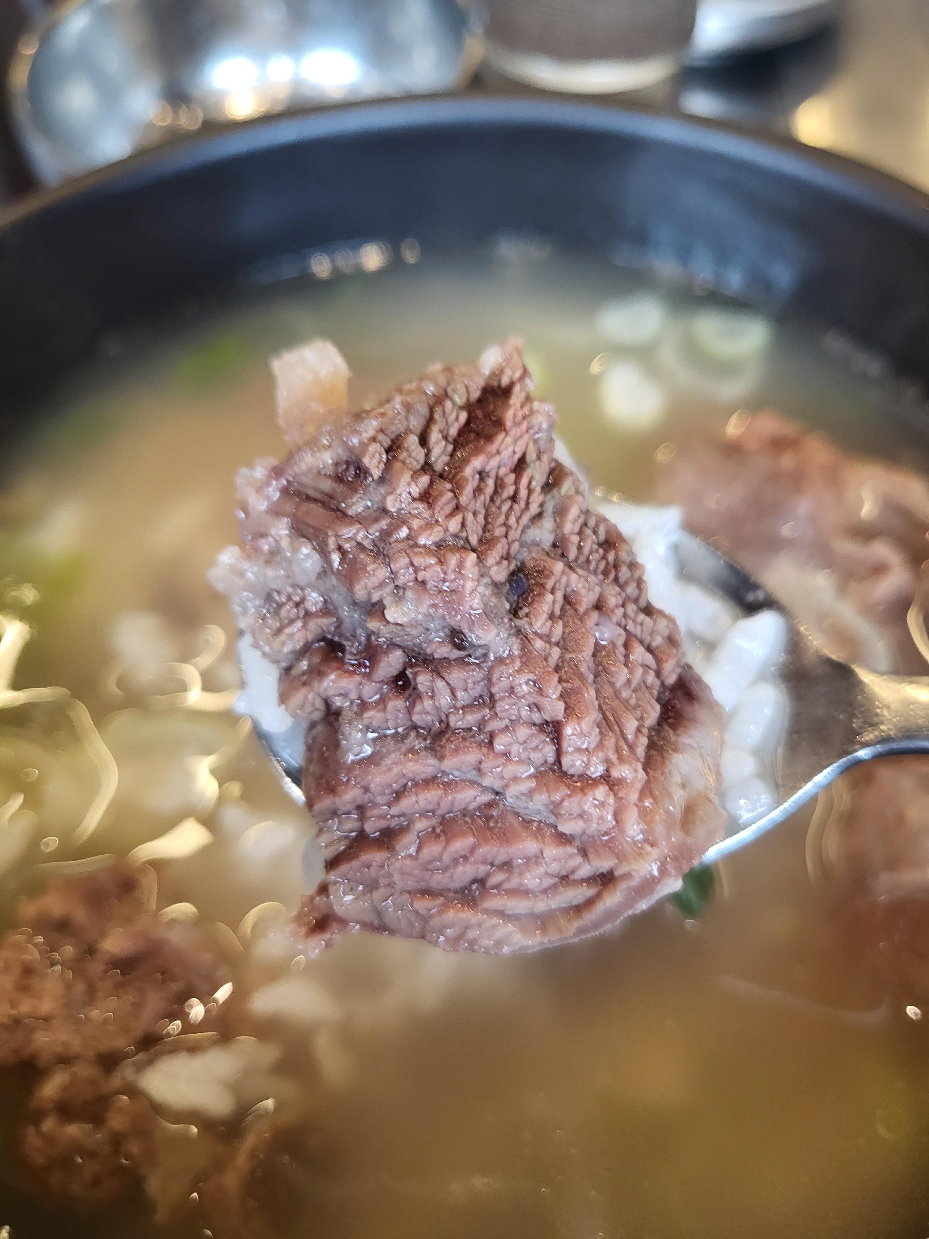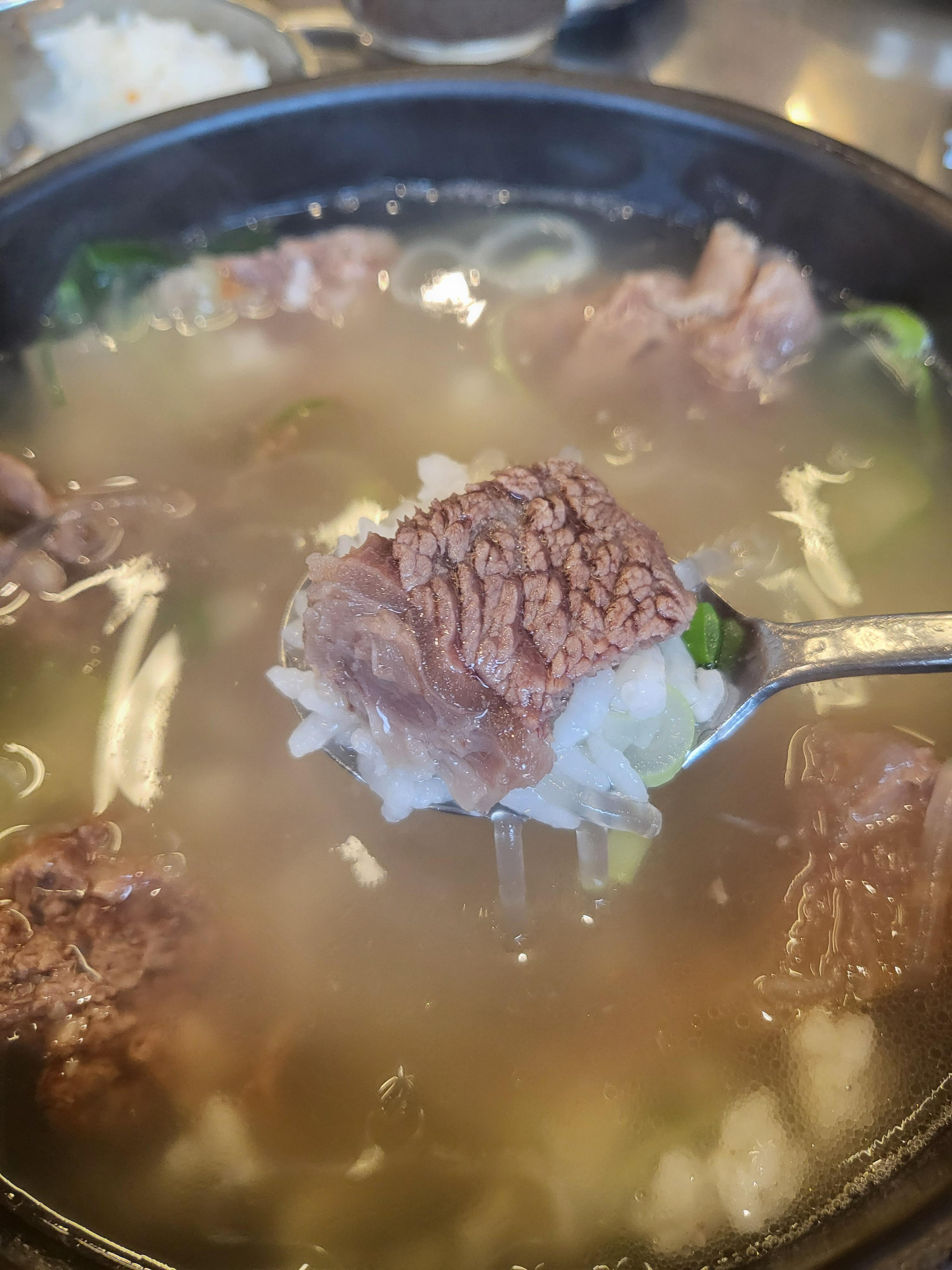 기대를 품고 국물이랑 밥이랑 먼저 먹어보았는데 맑은 고기 국물이 시원했고 고기도 먹을만하더라고요. 뼈에 붙어있는 힘줄 부분은 조금 질기긴 했지만 그래도 전체적으로 맛은 있었습니다.
