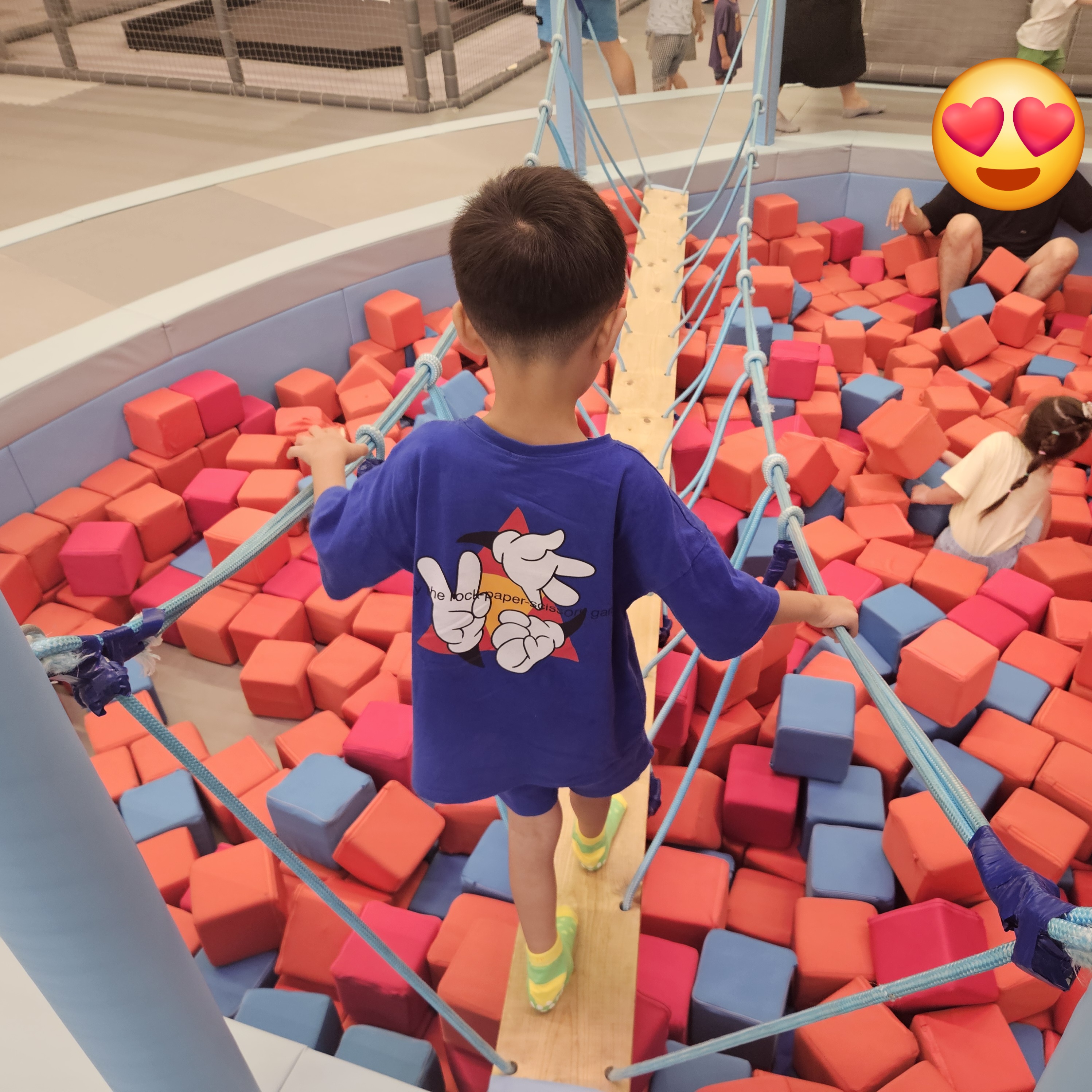 그렇게 자기 순서가 되어 도전을 해보았지만 첫 번째 다리는 너무 흔들려서 무서웠는지 바로 포기하고 두 번째 큐브다리를 건너는데 조심조심 도전하는 모습이 어찌나 기특해 보이더라고요.