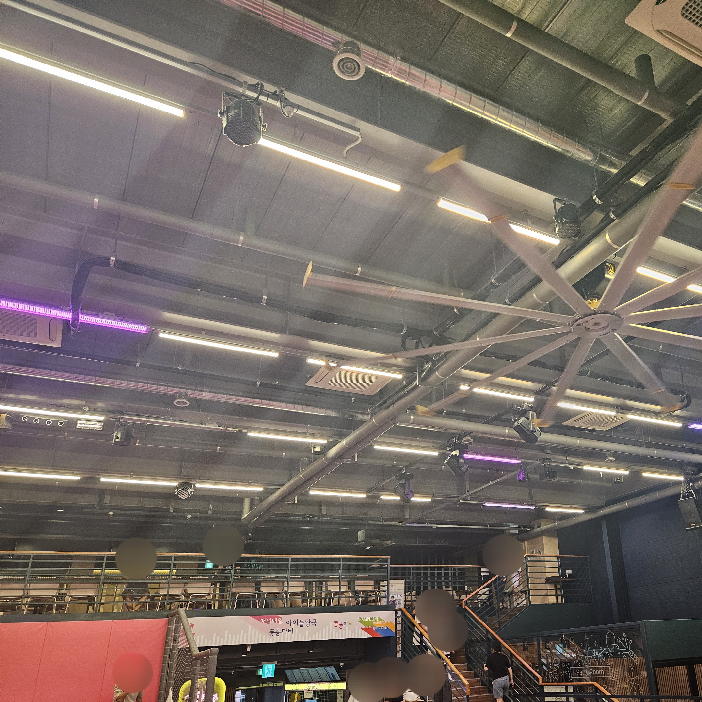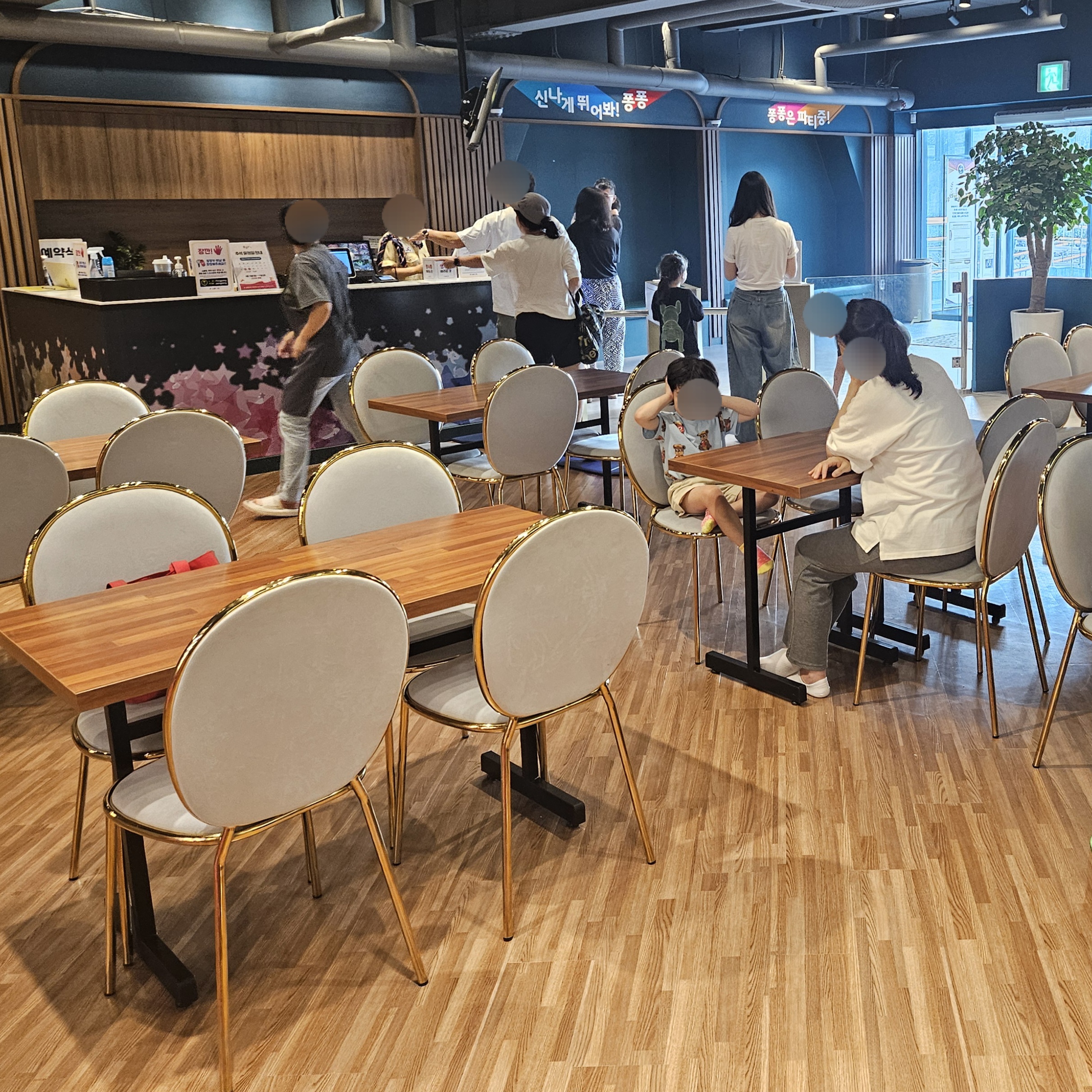 그리고 내부가 엄청 넓어 2층에서 아이들 잘 놀고 있나 구경하는 부모님들도 있었고 여기 음식이 맛있는 건지 입구에 있는 테이블 외에도 놀이시설 1, 2층에도 테이블이 엄청 많이 배치되어 있었습니다.