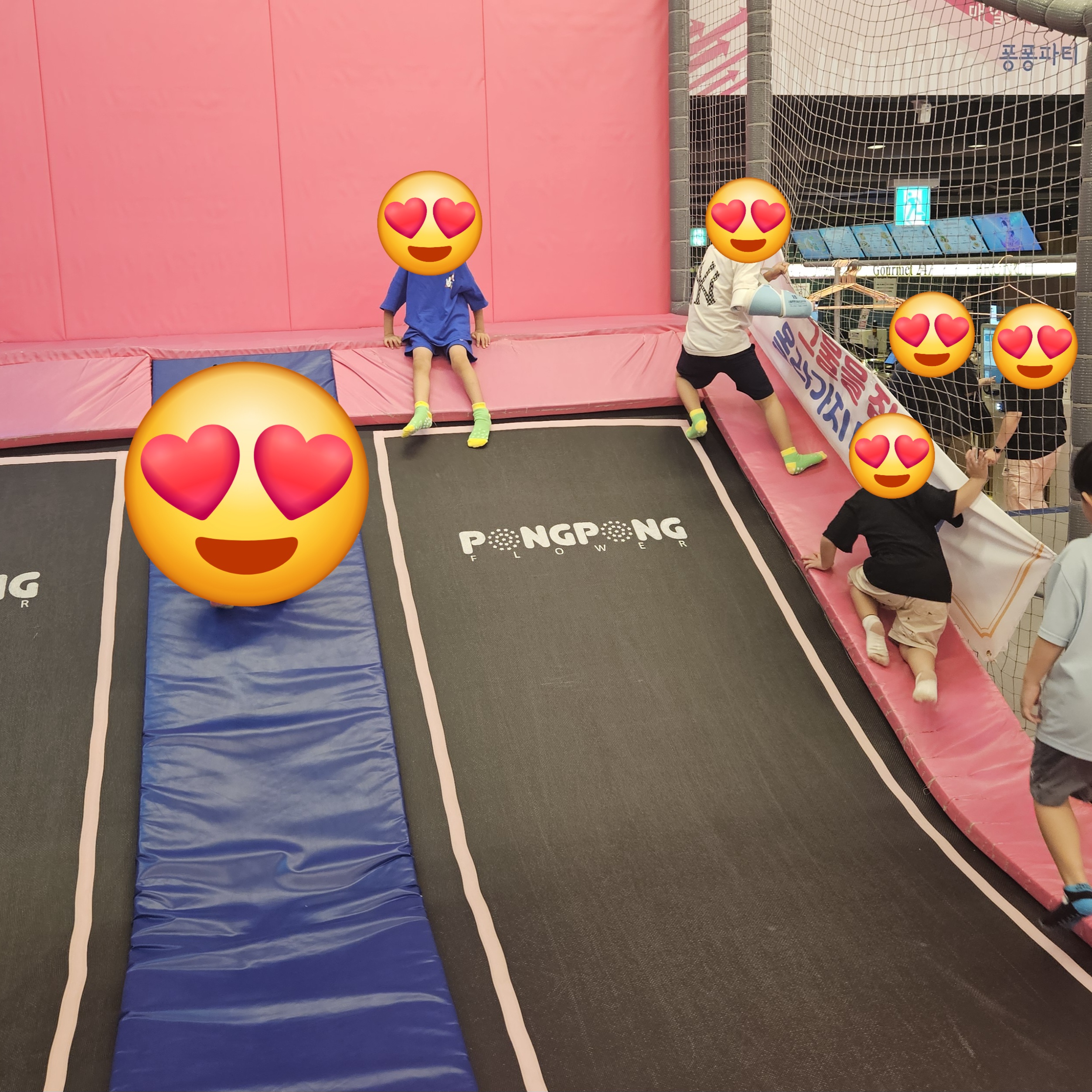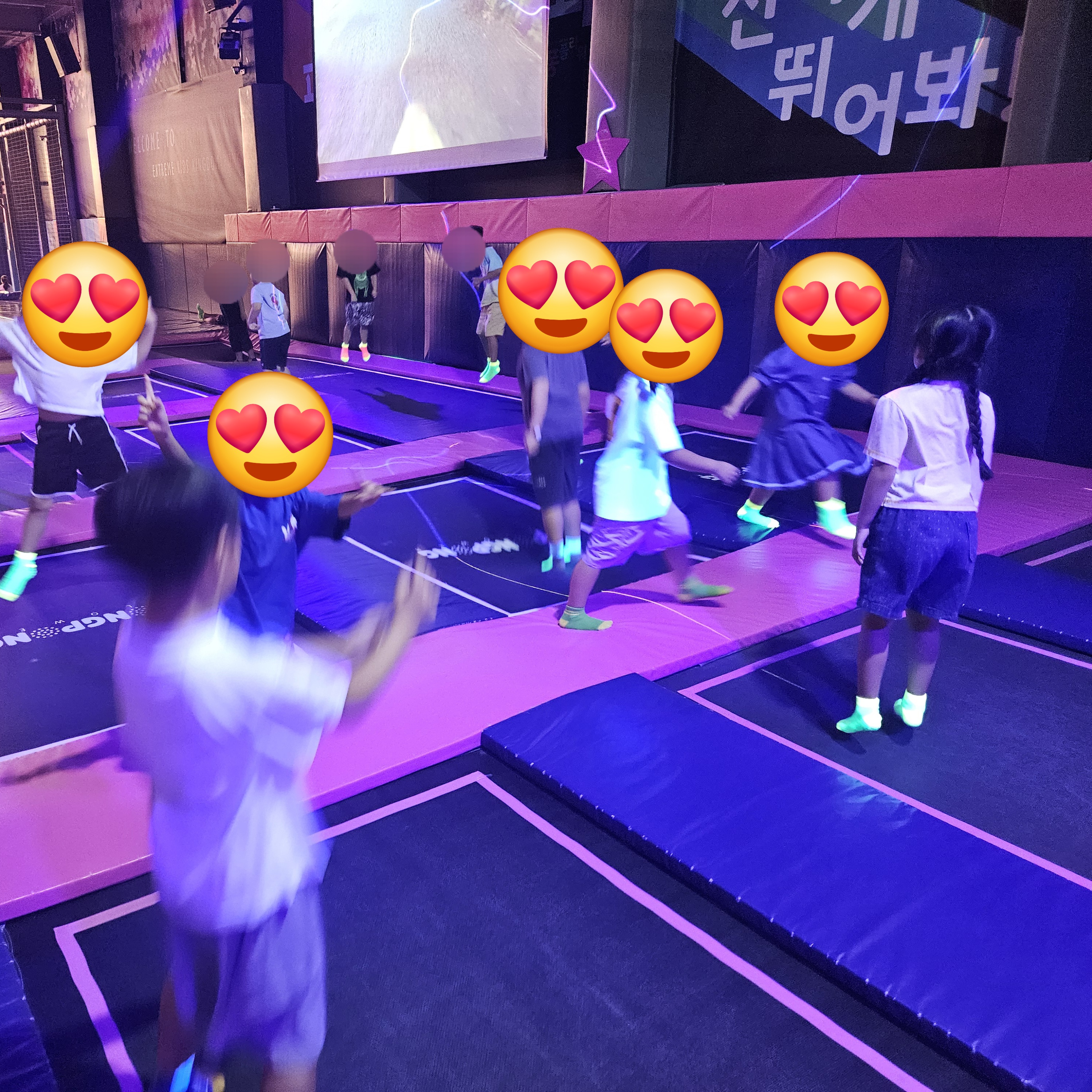 50분 되자마자 트램펄린 놀이시설에서 아이돌 뮤직비디오와 함께 불도 꺼지고 레이저쇼를 해주더라고요. 아들도 신나서 트램펄린에서 점프하면서 노는데 어찌나 귀엽던지. 중간중간 안개 같은 것도 쏴주고 처음 보는 아이돌 뮤직비디오도 오랜만에 볼 수 있어 저 또한 재미있었답니다.