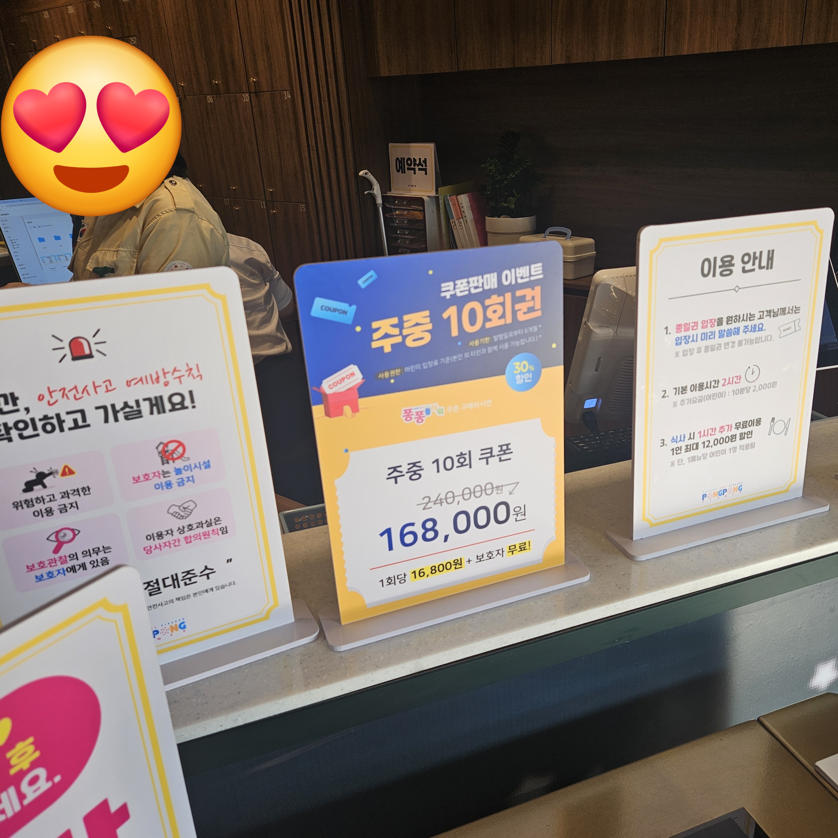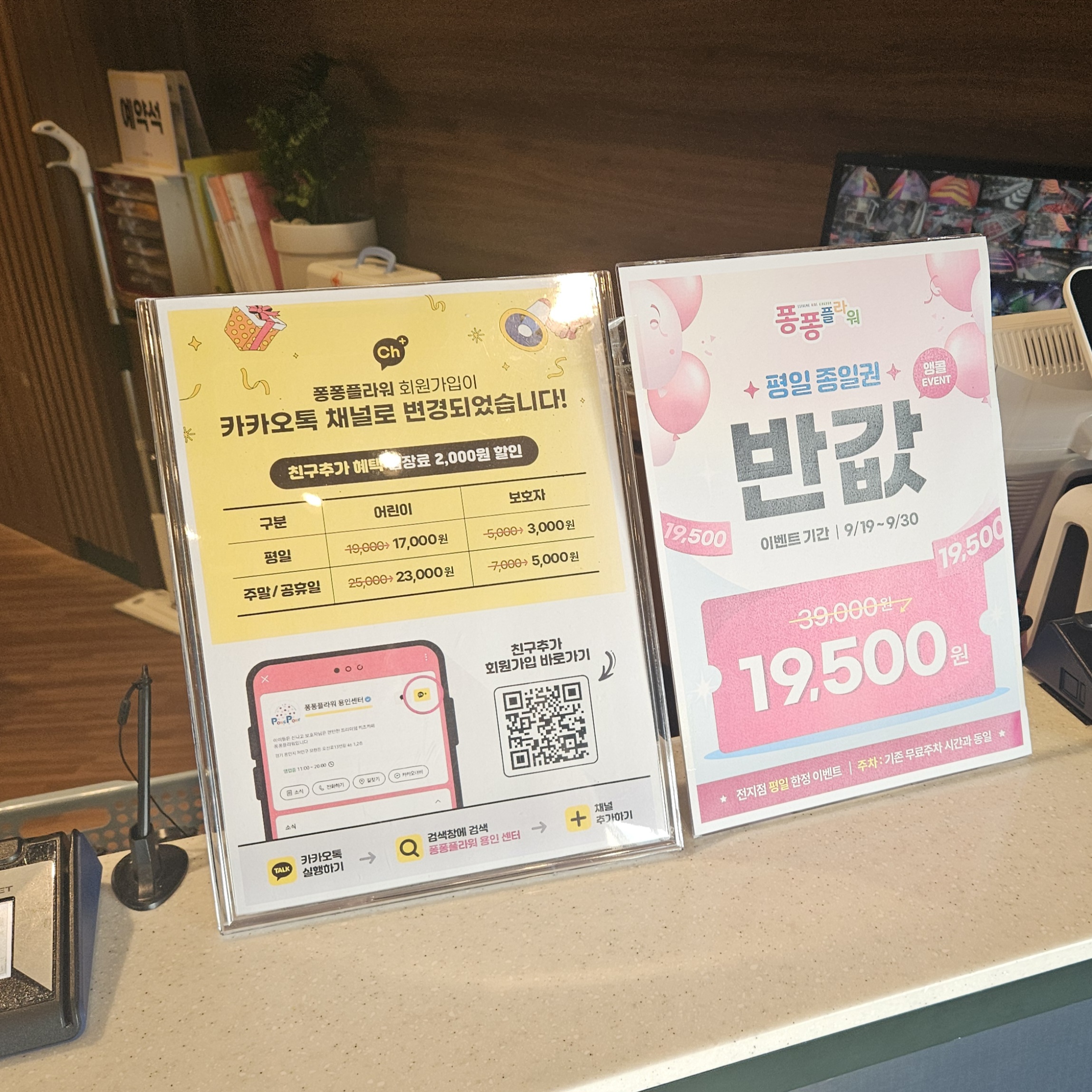 그 외 방문 당시에만 그런 건지 모르겠지만 퐁퐁플라워 카톡채널을 추가하면 입장료 2,000원씩 할인받을 수 있었고 주중 10회 쿠폰 및 9월엔 평일 종일권 반값이벤트도 진행하더라고요.