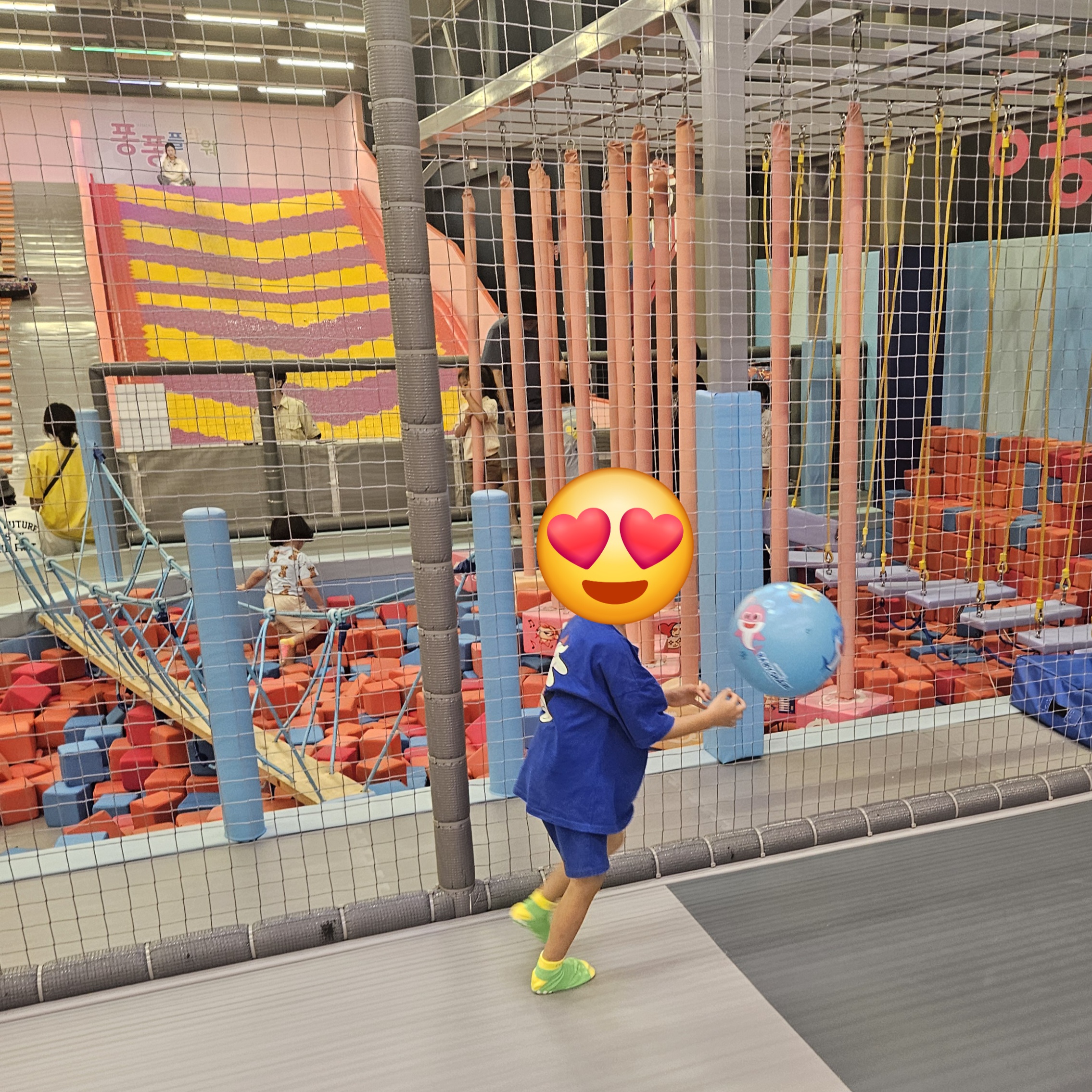 그렇게 댄스파티가 끝나고 아들이랑 공놀이도 같이했는데요. 공놀이 시설에는 공이 밖으로 잘 안나가게 그물망도 설치되어 있어 아이들이 신나게 빵빵차고 놀더라고요. 특히 방문 당시에는 형들이 많아 만 4세 아들이랑 구석에서 농구놀이를 했답니다.