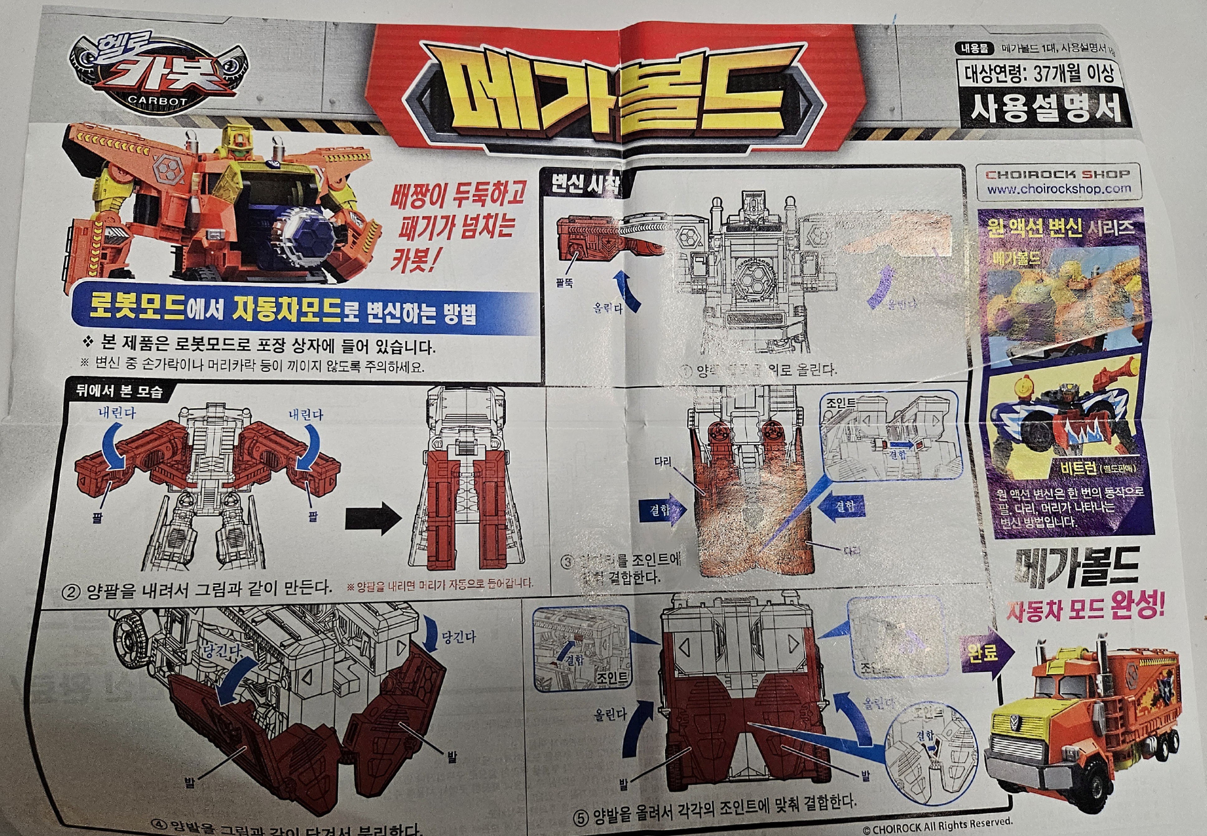 장난감을 쫌 만져본 아이들이라면 사실 설명서를 볼 필요도 없는 메가볼드. 원액션으로 그냥 팔부분을 좌, 우로 당겨주기만 하면 로봇 모드로 혹은 자동차 모드로 쉽게 변신할 수 있었는데요. 첫 헬로카봇 장난감으로 이만한 장난감은 없을 듯합니다.