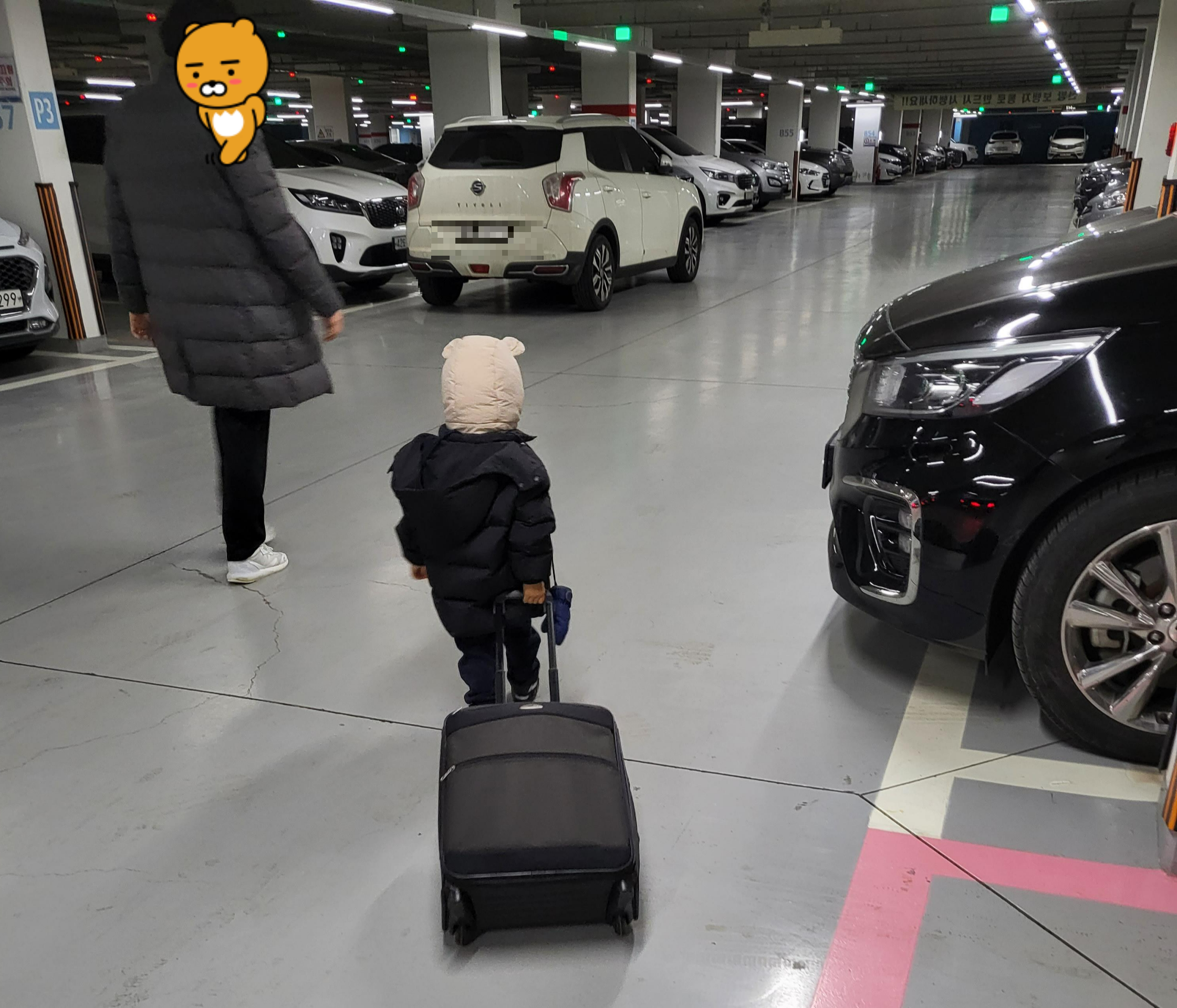 일 때문에 제주도에 혼자 거주하시는 장인어른이 손주보고 싶다고 하셔서 오랜만에 제주도 여행을 하게 되었습니다. 물론 31개월 아들은 제주도 여행은 처음이지만 비행기를 탄다고 하니 여행 전날부터 기분이 들떠있었는데요. 여행 당일 케리어를 끌어보겠다며 지하주차장까지 혼자 케리어를 끌고 가는 아들 힘이 장사더라구요.