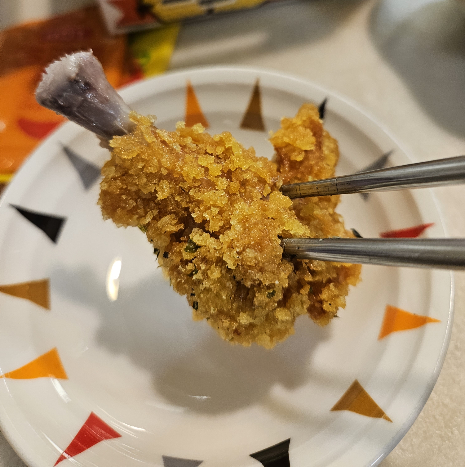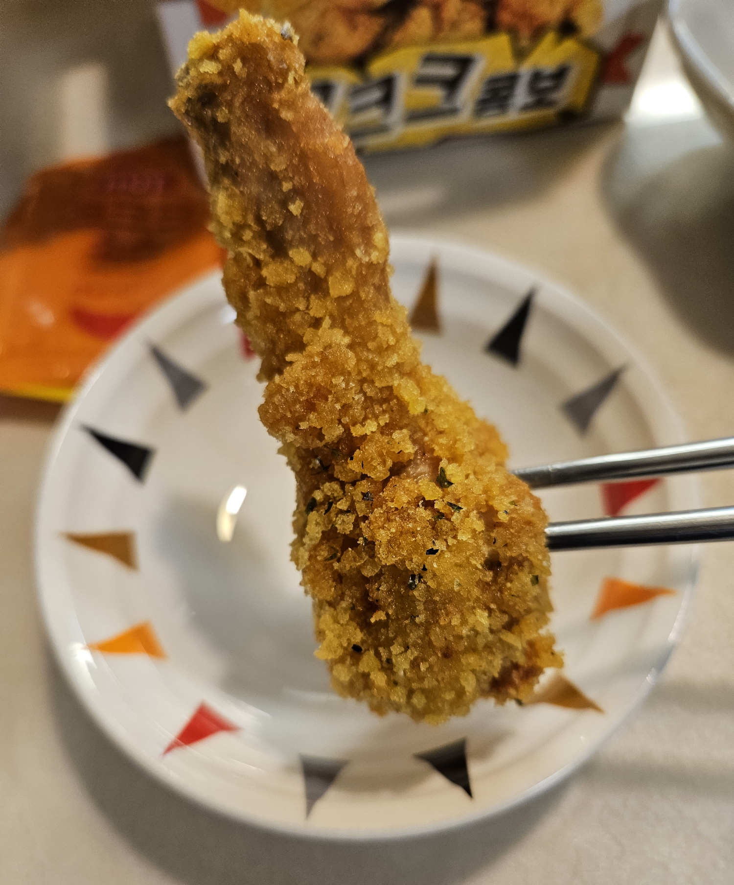 ▼일단 닭다리를 하나 들어보니 일반 후라이드 치킨이랑 모양은 그렇게 다르진 않았는데요. 한입 베어 먹어보니 튀김이 다르더라고요.