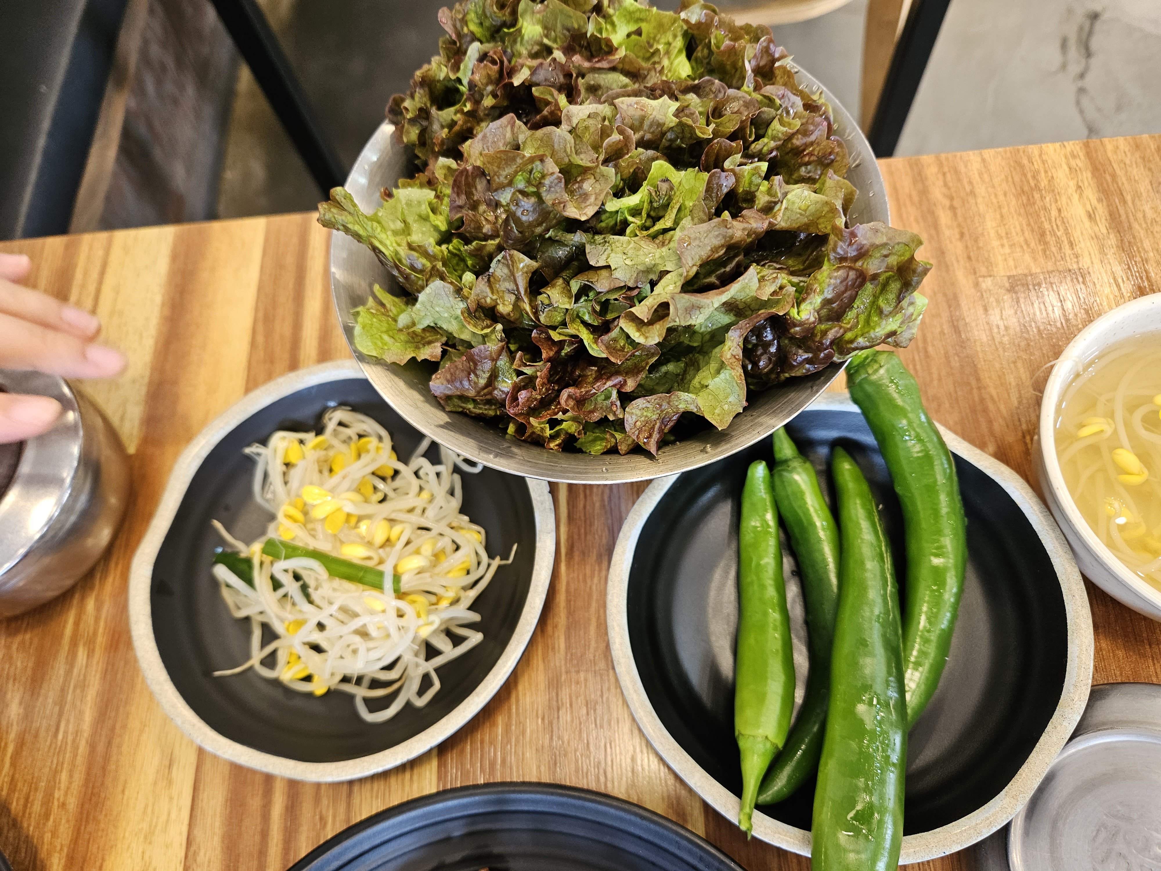 633추어탕집인 만큼 메인 메뉴는 추어탕이긴 하지만 방문만 하면 추어탕만 먹어서 색다른 음식을 시켜보았습니다. 우선 저희가 시킨 순대국+육개장+긴장불고기 메뉴를 시키면 김치, 콩나물, 쌈야채, 콩나물국, 고추가 나오더라고요. 쌈야채랑 콩나물국은 간장불고기를 시켜서 준 게 아닐까 추측을 해봅니다.