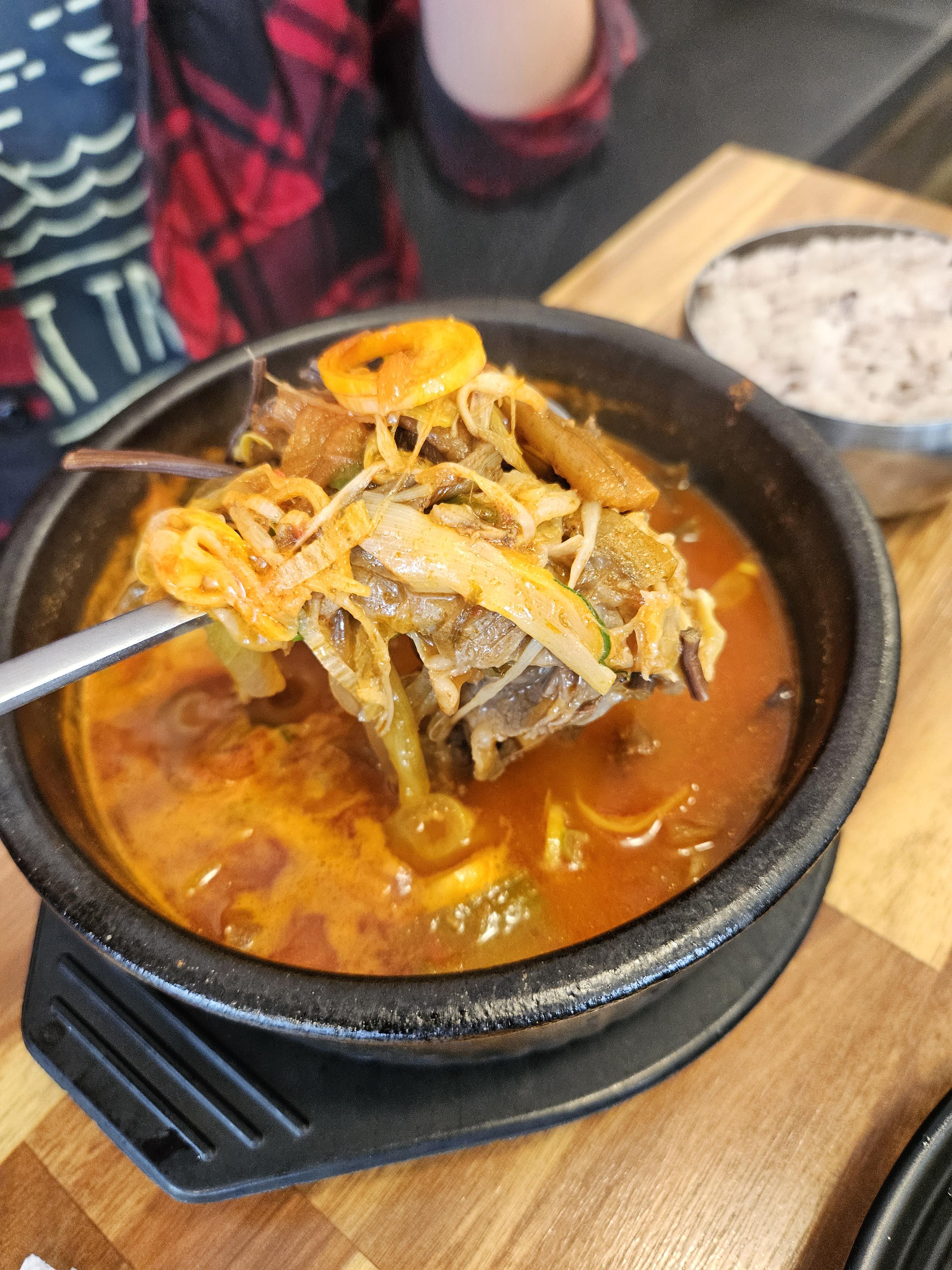 두 번째로 육개장 와이프가 며칠 전부터 육개장 먹고 싶다고 하더니 633추어탕집 메뉴에 육개장이 있어 고민도 안 하고 시키더라고요. 고기도 많이 들어가 있고 건더기도 많이 들어가 있어 맛있다고 하길래 한입 먹어봤는데 확실히 맛있었습니다.