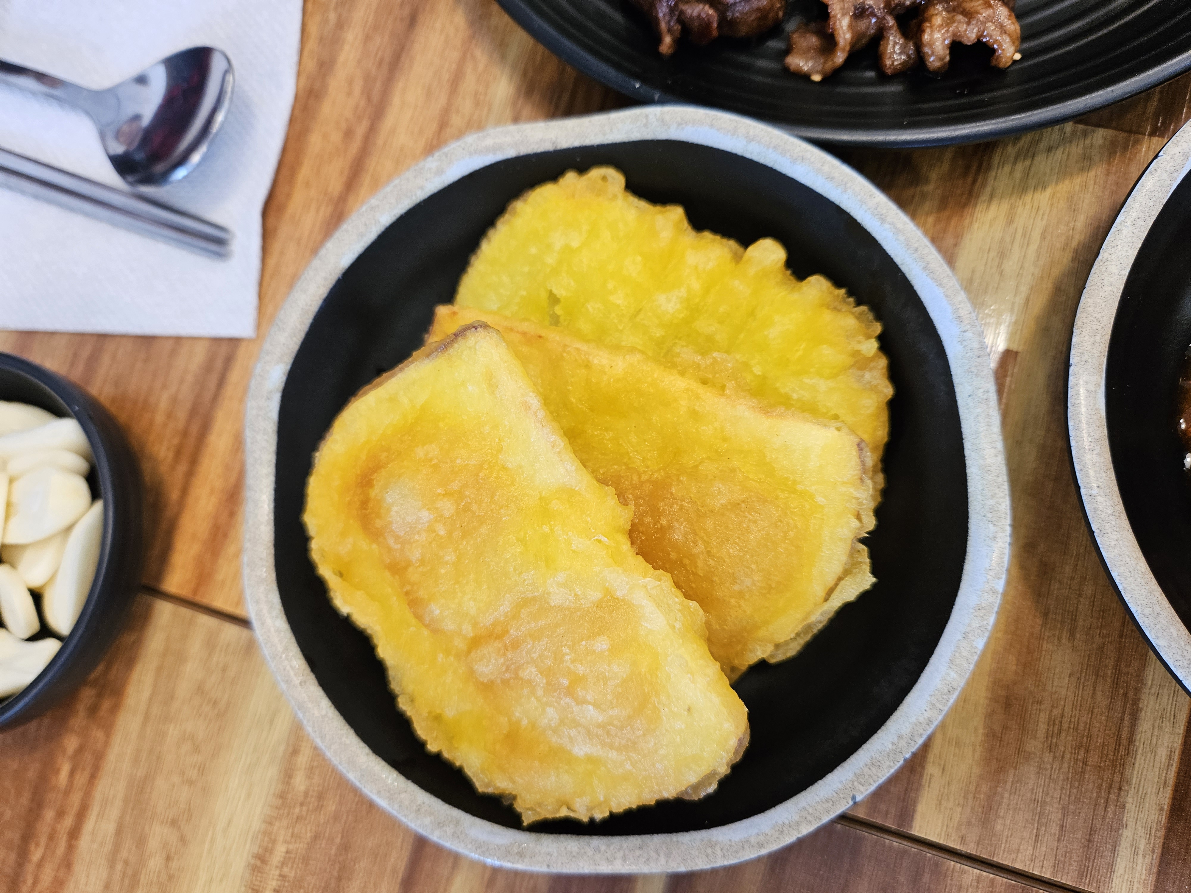 그리고 어떤 음식을 시켜도 나오는 633추어탕&김이네행복한족발집에 시그니처 고구마튀김까지 진짜 고구마튀김을 얼마나 잘 튀겼으면 엄청 바삭바삭하고 저희 아들이 정말 맛있게 잘 먹는 서비스 반찬입니다.